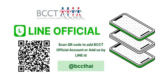 To find out more about the Chamber, its events, or other related activities, please visit our website https:// members.bccthai.com/ or email Greg Watkins at greg@bccthai.com. We encourage you to join our new LINE Group, at @bccthai