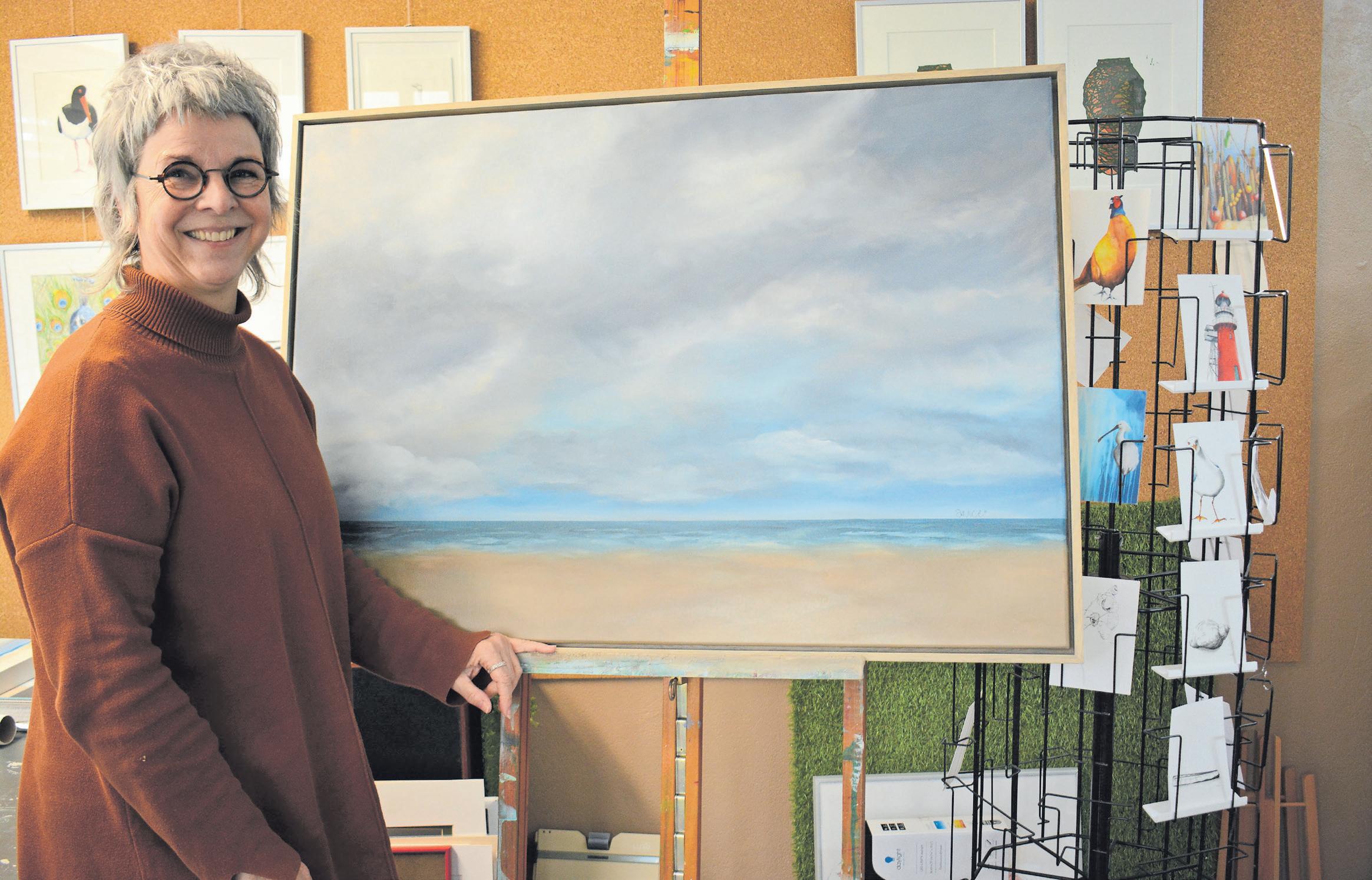 Terug naar de Reddingbootschuur: het werk van Anke, met als thema zee, strand, vogels en dieren, valt bijzonder in de smaak bij het publiek. Ze verkoopt kleine schilderijtjes, grote werken, stolpjes met mini-aquarellen en ansichtkaarten. ”De vraag was groot en mijn leven werd gevuld met werken bij de gemeente en
