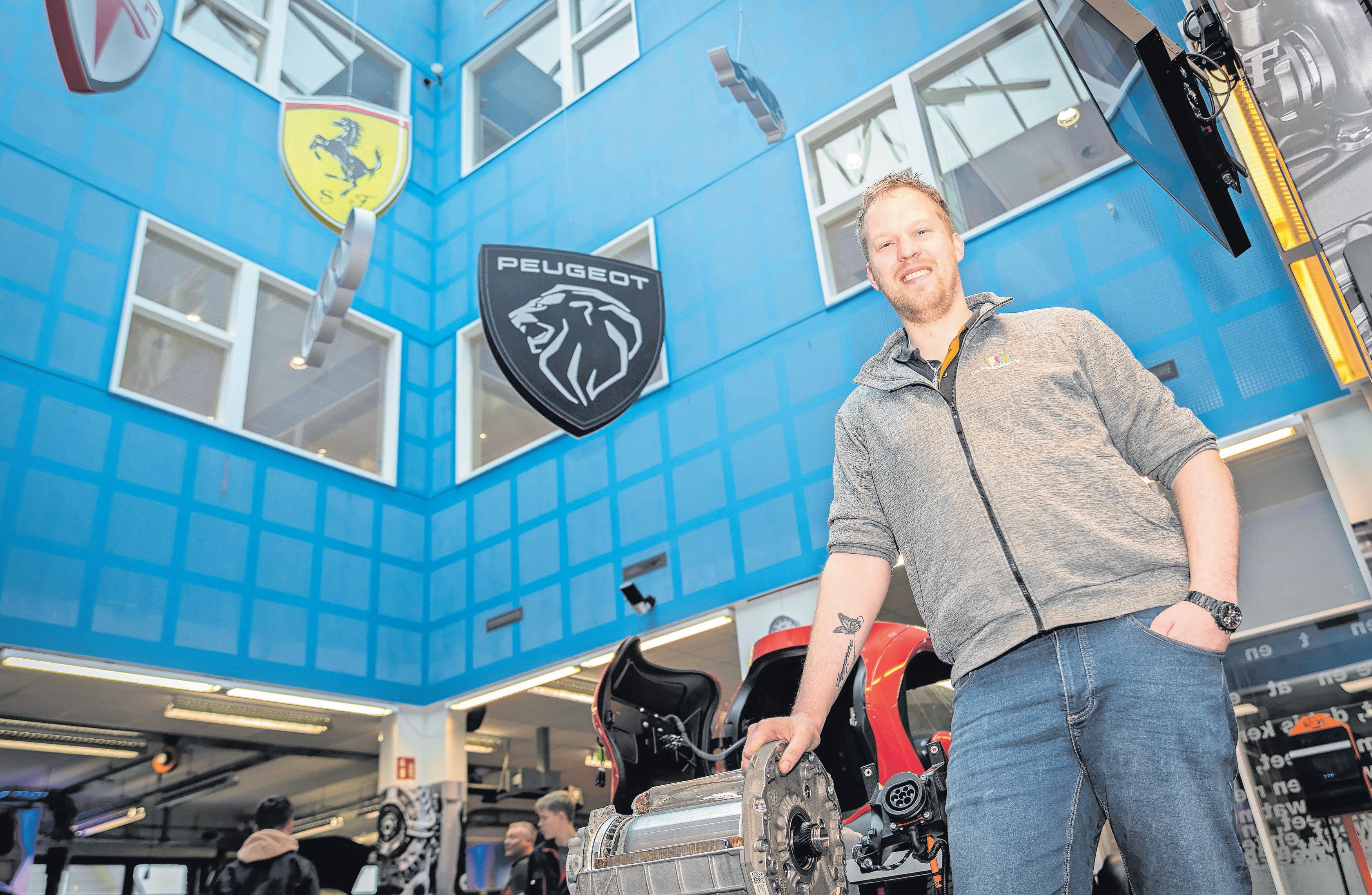 contact maak met anderen.’’ De boomlange docent – 2.07 meter lang – vertelt vol passie over zijn nieuwe baan bij De Meerwaarde in Barneveld. Hij laat trots de werkplaats zien waar de leerlingen alles krijgen te horen en zien over auto’s. Op de muur hangen stoere posters van snelle wagens, terwijl in de lucht levensgrote 3D-modellen hangen van populaire merklogo’s zoals Ferrari, Peugeot en Audi.