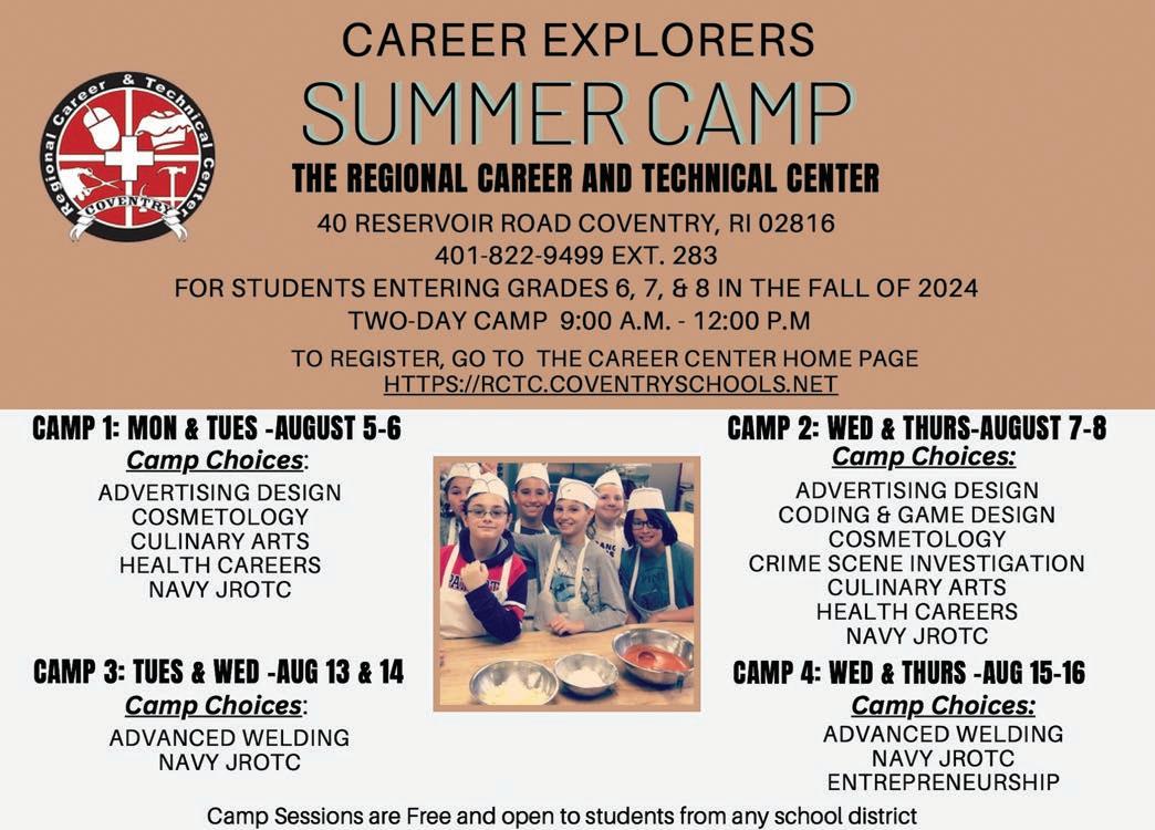 The Reminder May 1, 2024........Page SAY YOU SAW IT IN THE REMINDER 3 USDA GRADE A BONELESS CHICKEN CUTLETS OR BONELESS THIGHS $2.99lb. USDA Choice NY Sirloin Steak $ 9.95 lb. Grill Time! T-Bone Steaks $ 12.99 lb. Family Pack Ground Chuck $ 4.99 lb. Sliced Thin for Salads! Flat Iron Steaks $ 8.99 lb. Tom's Own Marinated Steak Tips Wow! $ 12.99 lb. Family Pack Boneless Pork Chops $ 3.99 lb. MEATS TOM'S OWN FRESH CUT FRUIT $4.99 lb. Florida Grown Sweet Corn 3 pack - Save $1 $ 2.9 9lb. Great on the Grill! Vidalia Onions $1.69 lb. Garden Fresh Plum Tomatoes $1.69 lb. Fresh Cut Seedless Watermelon .99 lb. Fresh Sweet Strawberries and Blueberries Save $2 ea. $3.99 ea. Tom's Own Vegetable Kabobs Save $1 $4.99 lb. FRESH PRODUCE DAIRY/FROZEN Land O Lakes Spreadable Butter 7-8 oz. $ 2.29 La Yogurt 6 oz. 10/$ 7 Stonyfield Organic Milk 64 oz. - Save $1 $ 4.99 Jell-O Pudding or Gelatin 4 packs 2/$ 7 Friendly's Ice Cream 48 oz. 2/$ 9 Talenti Ice Cream 10.7-16 oz. $ 4.99 Ben & Jerry's Ice Cream Pints $ 4.99 MORE GREAT SPECIALS THROUGHOUT THE STORE – COME IN AND SEE WHAT WE HAVE TO OFFER! Due to manufacturer’s supply issues, some items may be in limited supply. Sorry, No Rain Checks Not Responsible for Typographic Errors. Some items may not be available in all locations. TOM’S MARKET COVENTRY 821 Tiogue Avenue • 401-826-0050 Mon.-Sat. 8am-7pm, Sun. 8am-6pm Prices in effect May 1May 7 WARREN 137 Child Street •401-289-2852 Mon.-Sat. 8am-8pm, Sun. 8am-7pm TIVERTON 492 Main Road • 401-816-0862 Mon.-Sat. 8am-8pm, Sun. 8am-7pm Fresh . Local . Exceptional . DELI Kretschmar Bacon Topped Turkey ............. $ 10.99 lb. Hummel Bros. Rare & Juicy Roast Beef .......... $ 10.99 lb. Boar's Head Cracked Peppermill Turkey.... $ 10.99 lb. Kretschmar Honey Ham.................................. $ 7.99 lb. Boar's Head Lo-Sodium Ham ......................... $ 8.99 lb. PREPARED FOODS Three Citrus Grilled Chicken Thighs ......... $5.99 lb. Tom's Healthy Rubbed & Baked Chicken Wings $6.99 lb. Delicious Edamame Succotash ............... $4.99 lb. Spicy Red Beans and Rice ....................... $3.99 lb. Pulled Chicken Quesadillas 2/ $ 5 SEAFOOD BOAR'S HEAD AMERICAN CHEESE $5.99 Melt the Butter! Steamers $6.99 lb. Omega 3 Rich Salmon Fillets $12.99 lb. For the Grill! Marinated Jumbo Shrimp $9.95 lb. GROCERIES General Mills Cheerios 8.9 oz. Original or 10.8 oz. Honey Nut 2/$ 5 Post Pebbles or Honey Bunches of Oats 11-12 oz. 2/$ 6 Eight O'Clock Coffee Bags or K-Cups $ 6.99 Tuttorosso Canned Tomatoes 28 oz. 3/$ 5 Kraft Salad Dressings 16 oz. $ 3.99 Adirondack Seltzers 8 pack 2/$ 6 Fillipo Berio Olive Oil 16.9 oz. $ 7.99 BAKERY FRESH BAKED STRAWBERRY RHUBARB PIE 27 OZ. $ 5.99 ea. MUFFIN OF THE WEEK Banana Nut 4 pack $5.99 Delicious Strudel Bites 12 pack $3.99 Fresh Baked French Baguette 10 oz. $3.49 SWEET & FLAKY YELLOWTAIL SOLE $ 8.99 lb. TOM'S FAMOUS BBQ BURNT RIB ENDS $5.99lb. MADE IN STORE! SAVE $2 LB. Who will inherit your assets? Who would handle your nancial a airs and medical decisions if you were rendered unable to make them for yourself? Leave Nothing to Chance • Wills • Trusts • Estates • Divorce • Custody • Visitation • Personal Injury • Landlord/Tenant • Bankruptcy with expert estate planning you can trust Law O ce of Steven J. Hart 328 Cowesett Ave., Suite 3, West Warwick, RI Call 828-9030 www.hartlawri.com Dial Oil Service Fuel Assistance Vendor Automatic Delivery Contracts Available Family Owned & Operated Coventry 821-4447 Pet. Lic. #30 For Prompt Friendly Service “BEE” SMART $5.00 Off 100 Gallons *New customers only with this coupon Helping Local Businesses Thrive & Survive SINCE 1954 Call us at 821-2216 to advertise your business for your continued loyalty Thank You AURORA HEATING & FUEL CO. Quality Home Heating Oil at a LOW PRICE! 401-823-5996 GIRL SCOUT TROOP 945 COLLECTING SCRAP METAL You can donate your scrap metal to support Girl Scout Troop 945. For pickup, call 702-7724 or you can drop it off on May 19 at Autoland in Coventry.