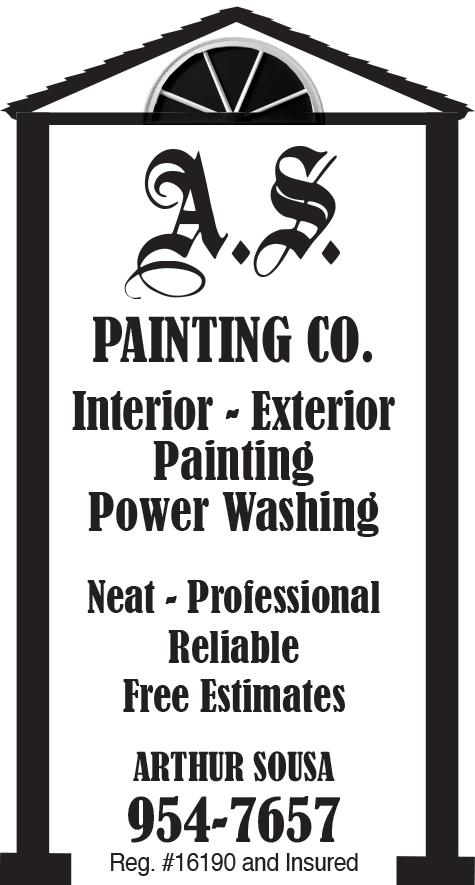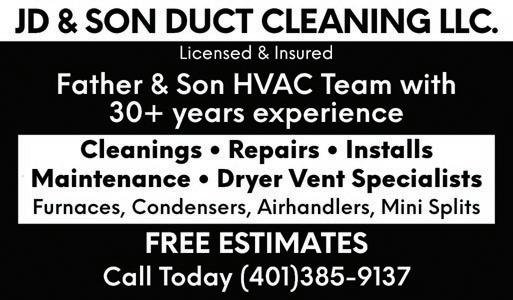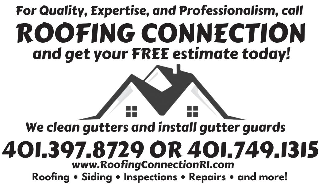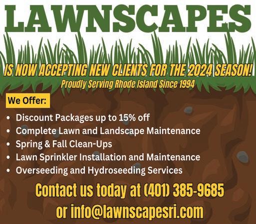 K. Wilcox Landscaping Inc. Landscape Lighting Outdoor Living Areas • Landscape Design • Lawn Installations • Masonry – Walks • Lawn Sprinklers • Backhoe • Retaining Walls • Excavating • Hydroseeding Call 392-3136 Ask for Kurt Email: wilcoxlandscaping86@verizon.net kwilcoxlandscaping.com Visit Our Nursery at 73 Hopkins Hill Rd., West Greenwich Member of RINLA Fully Insured Lic. #6442 OIL OIL Richard’s Oil 2 Station Street, Coventry 822-1543 YOUR #1 OIL DEALER 24 Hour Burner Service Radio Dispatch • Automatic Delivery Fuel Assistance Vendor • RI License #95. MPF #8357 Spring Has Sprung, Have your boiler cleaned NOW! Talk Person to Person 24/7 Interior Service Exterior Service Brush & Roller Work Pro Bleach & Ceiling & Wall Repair Power Washing Wallpaper Removal Sanding, Scraping Free Estimates Priming, Caulking Paint or Stain Call Brian Window Glazing (401) 737-2979 Deck Staining Text or Call (401) 390-8707 Gutter & Downspout Cleaning Email bdh122859@gmail.com Brian’s Home Painting License #10003 Over 25 Years Experience Spring gutter Cleaning ServiCe Peters’ Pool Service In-Ground and Above Ground POOL OPENINGS In-Grounds Starting at $250 Above Grounds Starting at $200 (Basic Pump Out Vacuum Included on both) WEEKLY/BI-WEEKLY MAINTENANCE In-Ground Pools starting at $50 Above Ground Pools starting at $40 Insured Please Call Richard Peters (401)573-6511 30 Years Experience Botox • Fillers • Bunny Lines • Crows Feet Forehead • Glabella • Gummy Smile • Lip Flip Masseters • Neck Band • Chin • Microneedling • Lip Filler Call To Book Your Appointment 401-749-0643 820 TIOGUE AVE., COVENTRY Marianne Woodruff Advertise Your Business Here! $30* 821-2216 $33