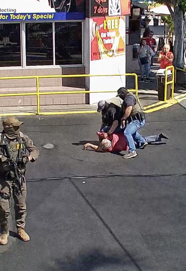 Federal agents wrestle Shoued to the pavement as a masked officer looks observes. | Photo courtesy of Robert Frank