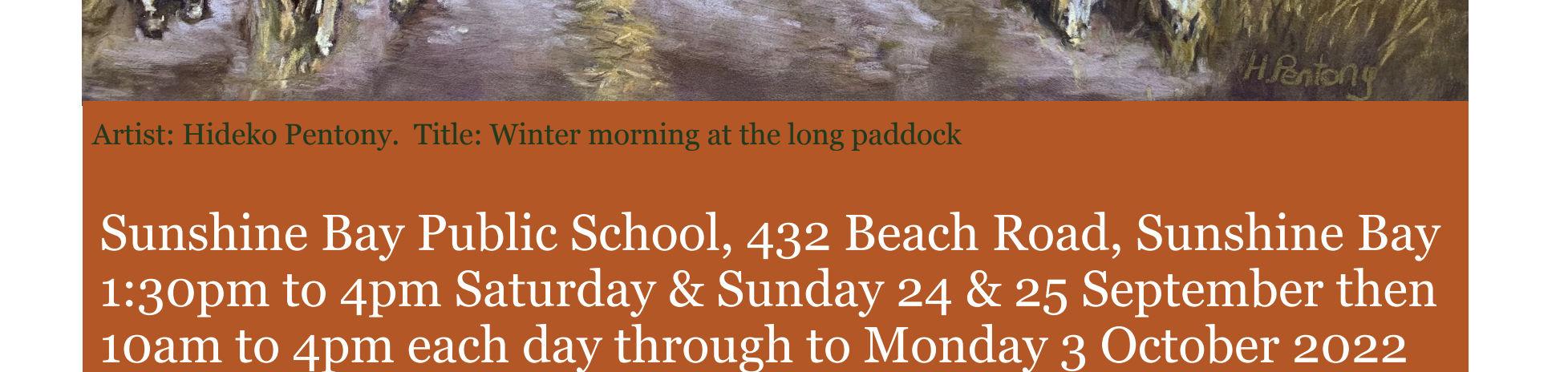 The exhibi on will be open from 1:30pm to 4pm on Saturday 24 and Sunday 25 September and from 10am to 4pm each day from Monday 26 September to Monday 3 October at the Sunshine Bay Public School, Beach Road, Sunshine Bay.