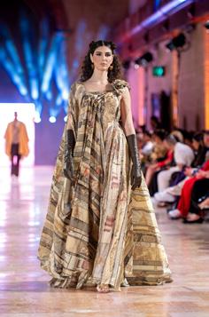 The colour story moved like a painted breeze: camel and sand for shifting dunes, blood red and turmeric for spice-laden journeys, and midnight blue for the twilight of sea crossings. Each piece was a passport of fabric, texture, and emotion.