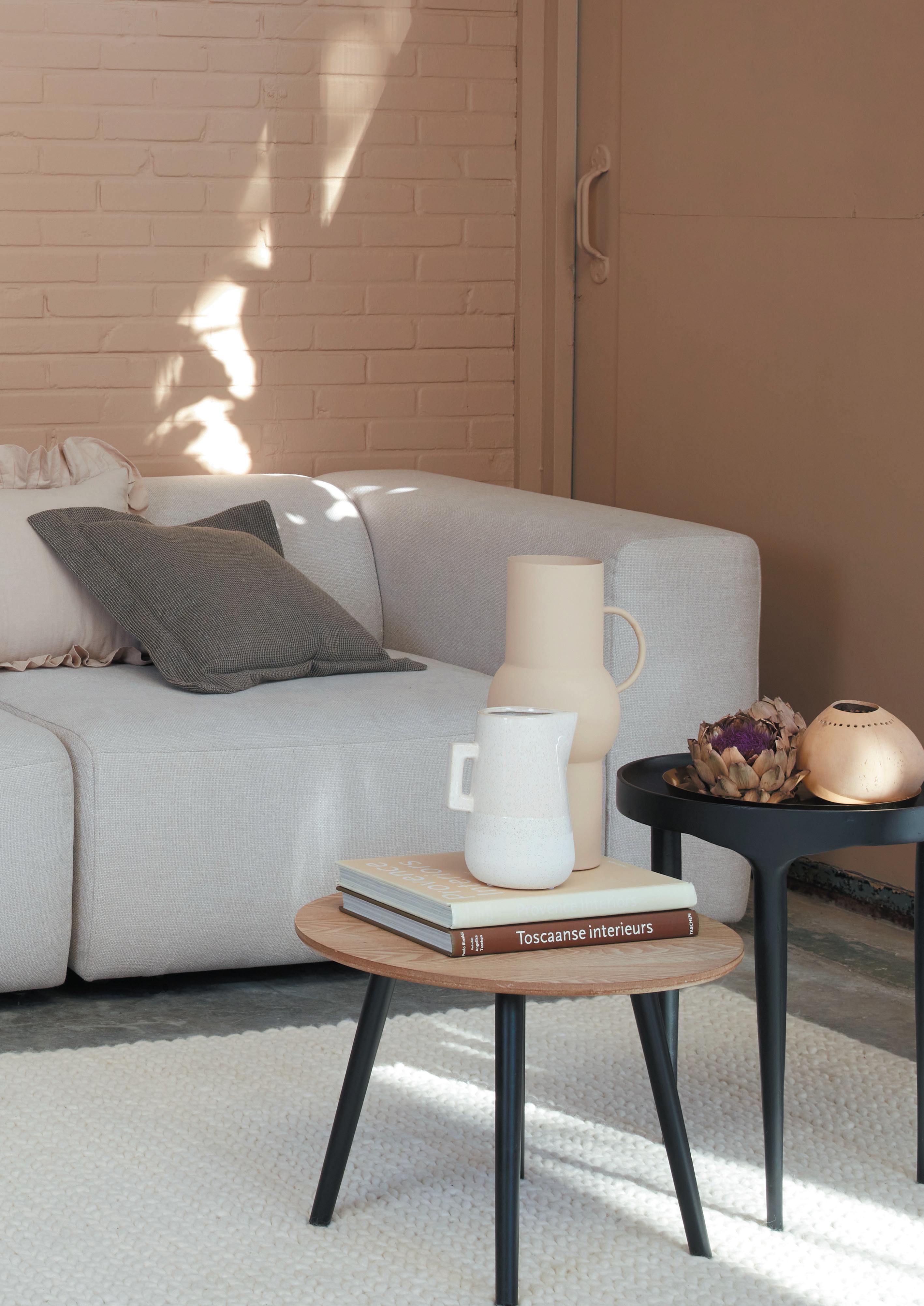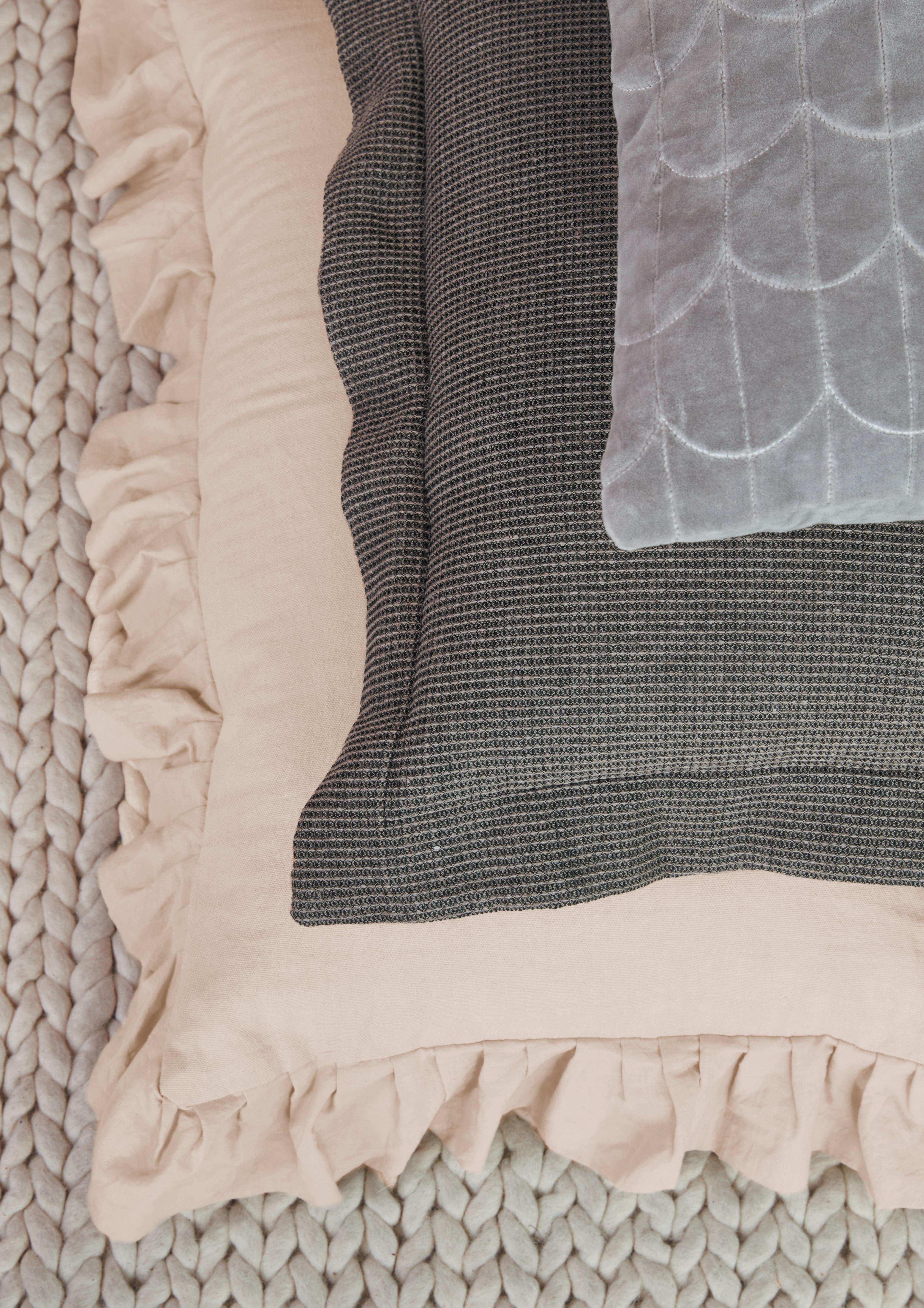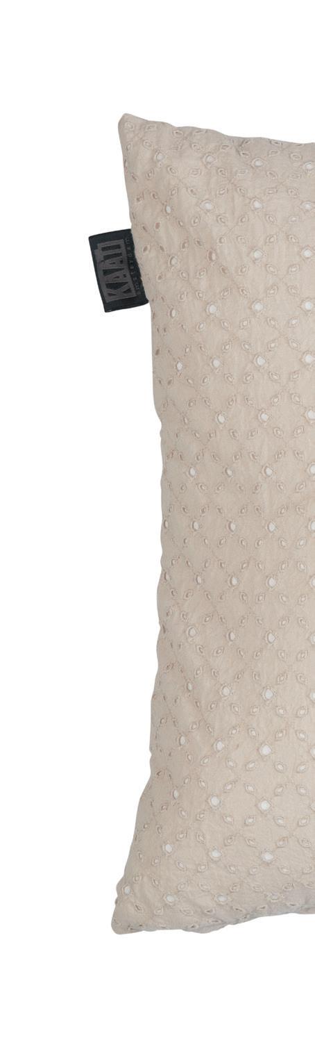 1. Emil Sand Made of 100% post-consumer waste. 50% acryl, 40% polyester, 10% other fibres. Woven Waffle with oxford border. 45x45 cm. 2. Faby Sand 100% cotton. Uni dyed with ruches on the edges. 40x60 cm.