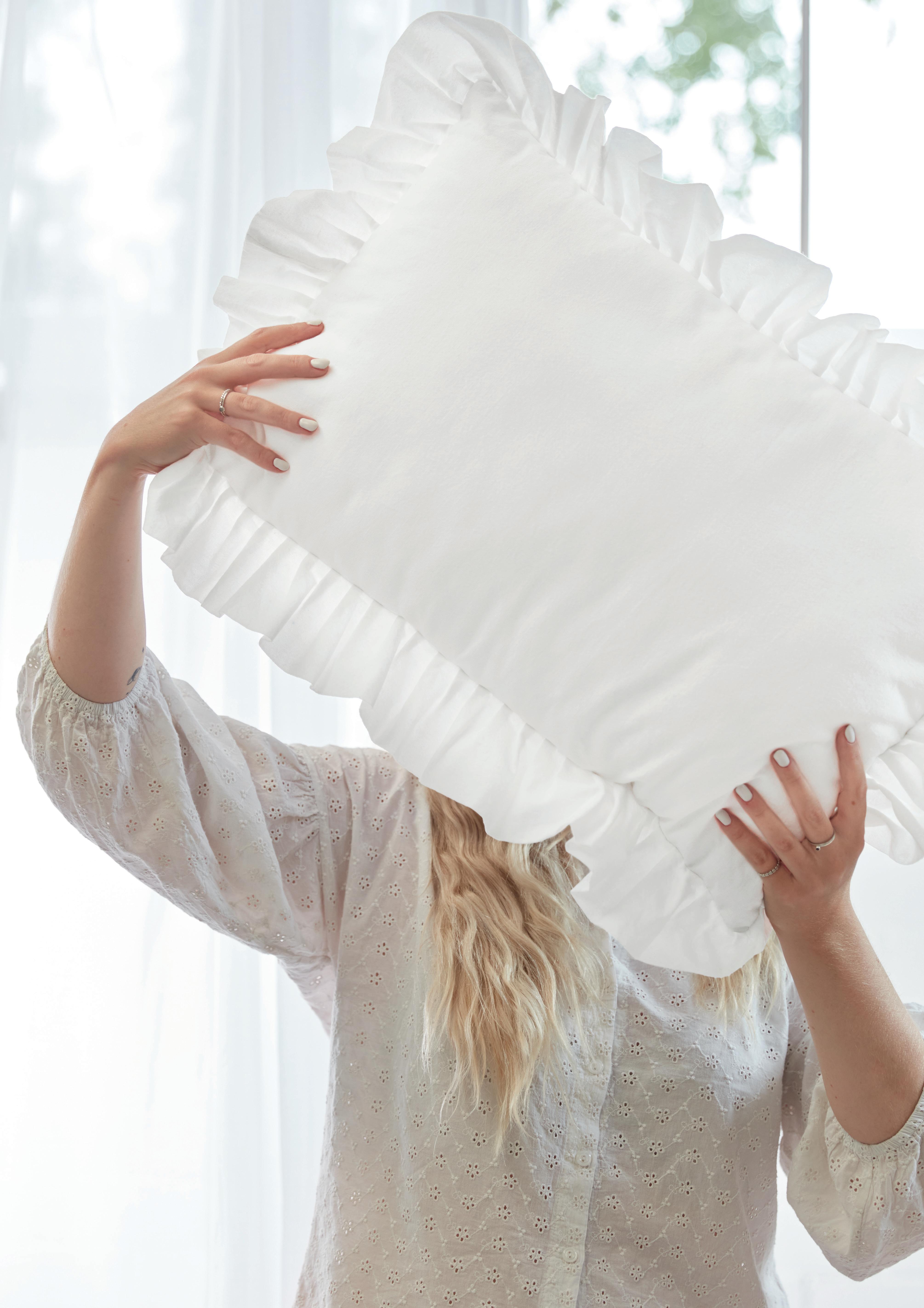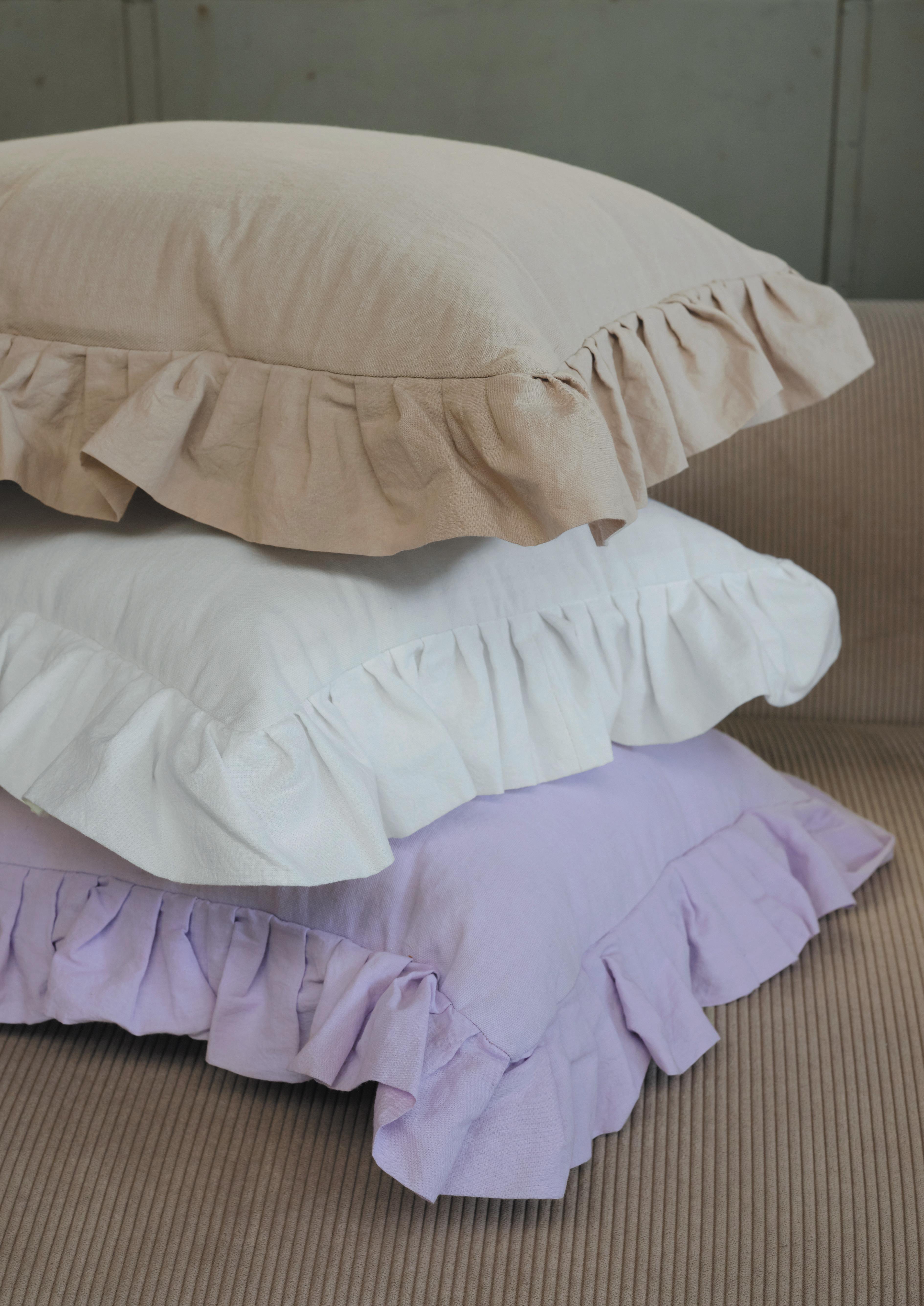 Faby White 100% cotton. Uni dyed with ruches on the edges. Sustainable developed. 40x60 cm.