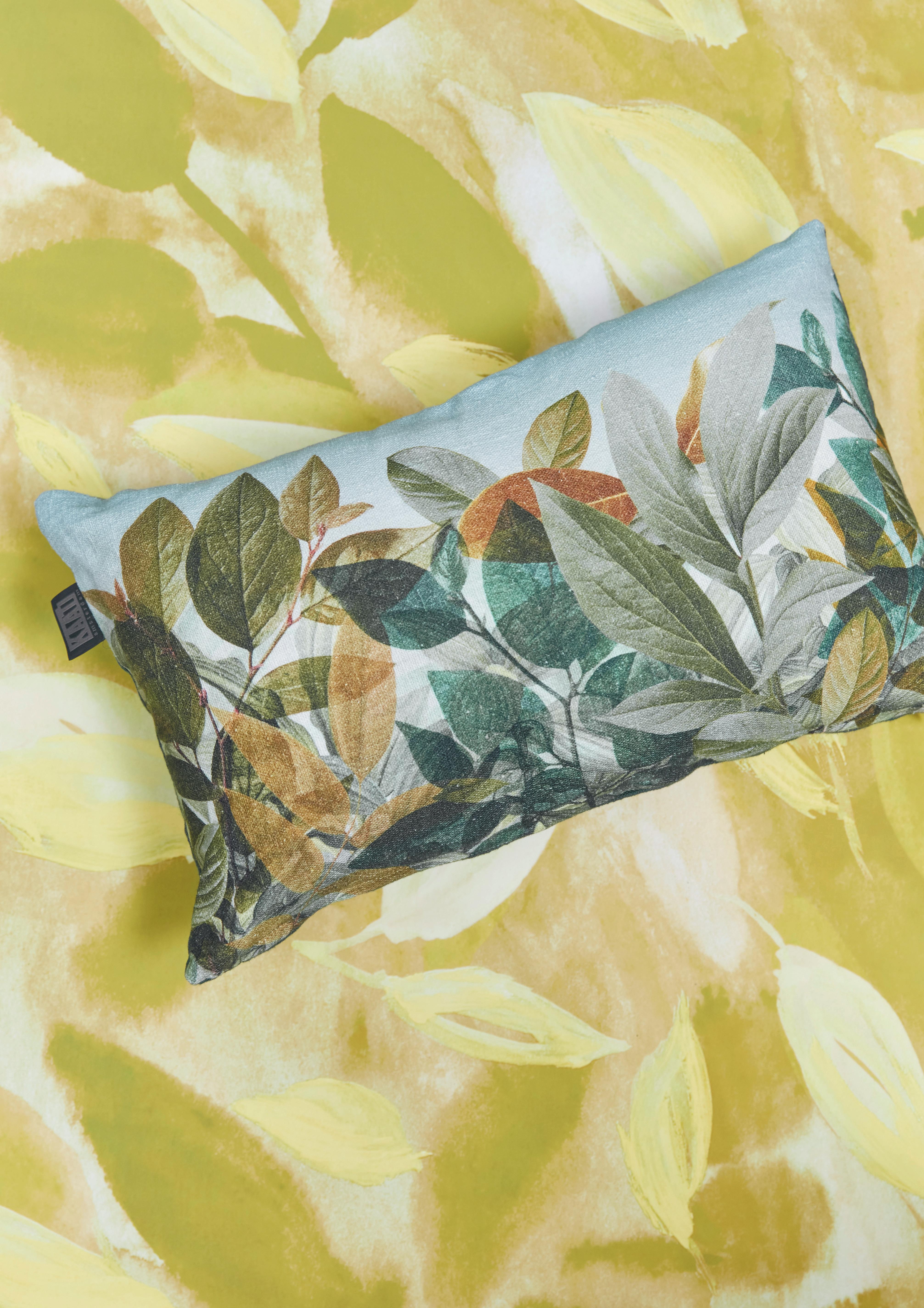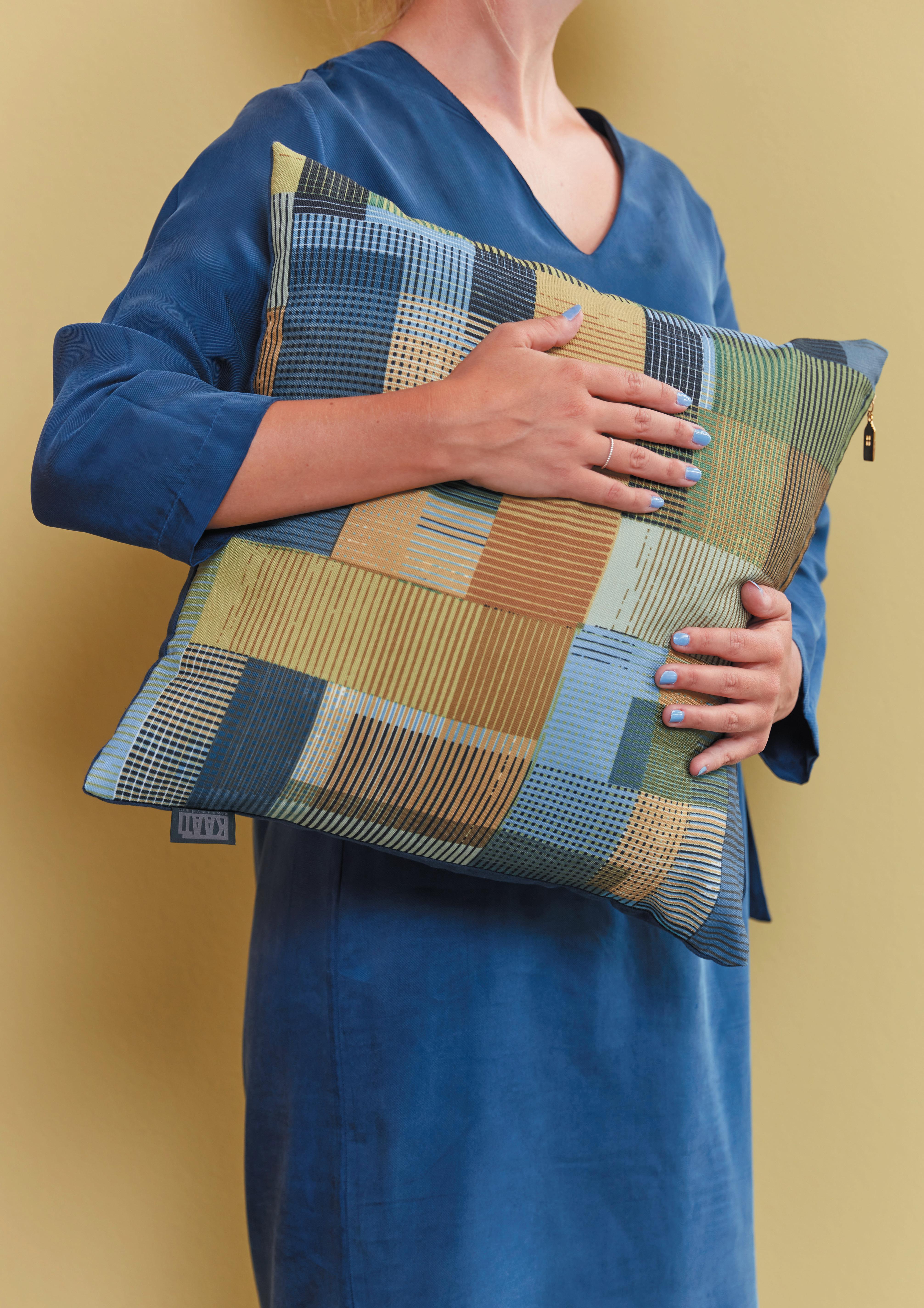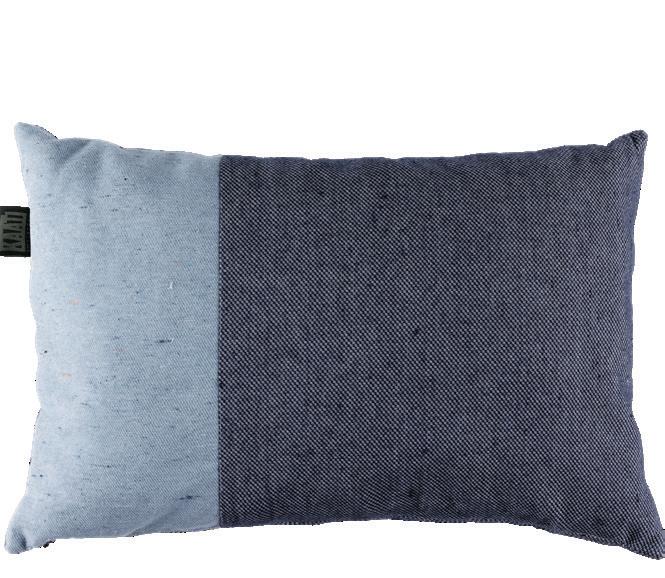 1. Emil Blue Made of 100% post-consumer waste. 50% acryl, 40% polyester, 10% other fibres. Woven Waffle with oxford border. 45x45 cm. 2. Olinda Blue Green 100% cotton slub. Digital print on front and uni dyed back. 30x50 cm.
