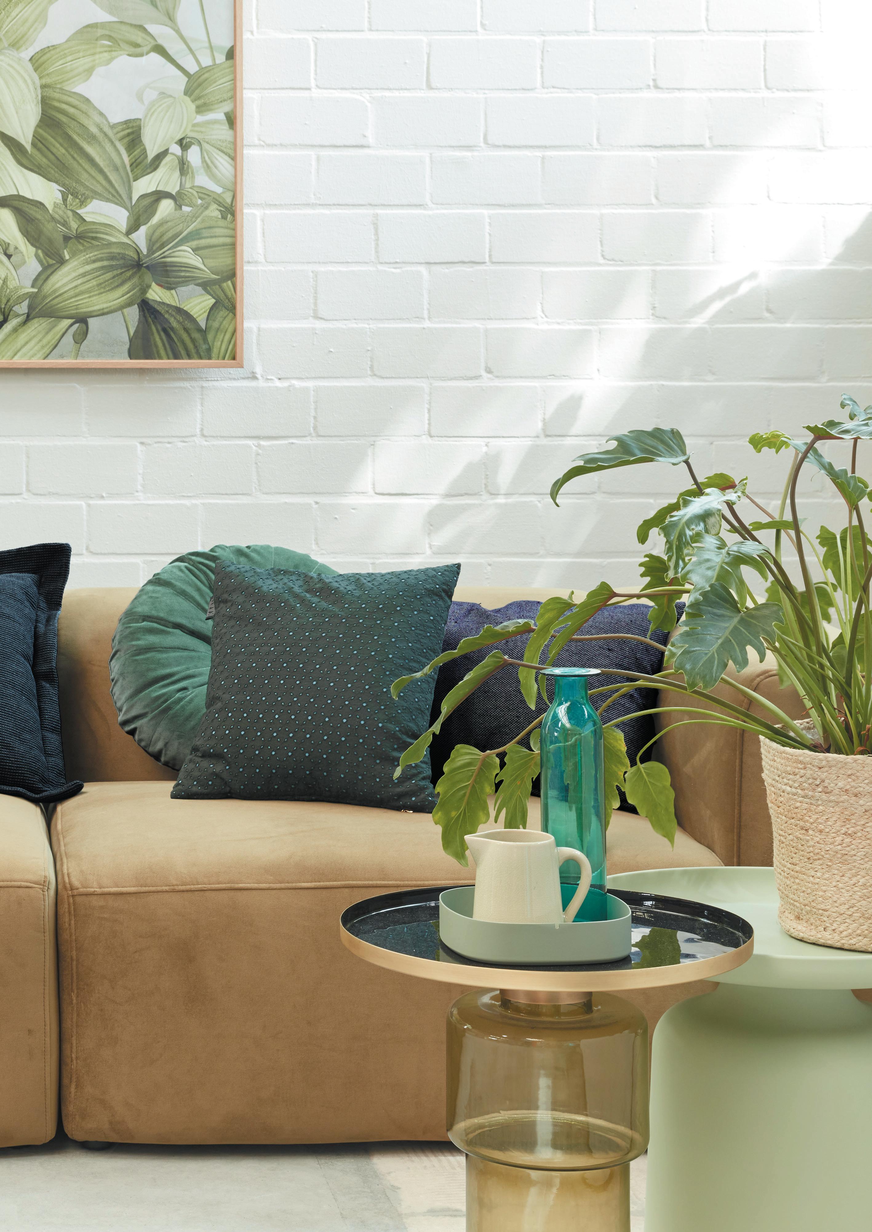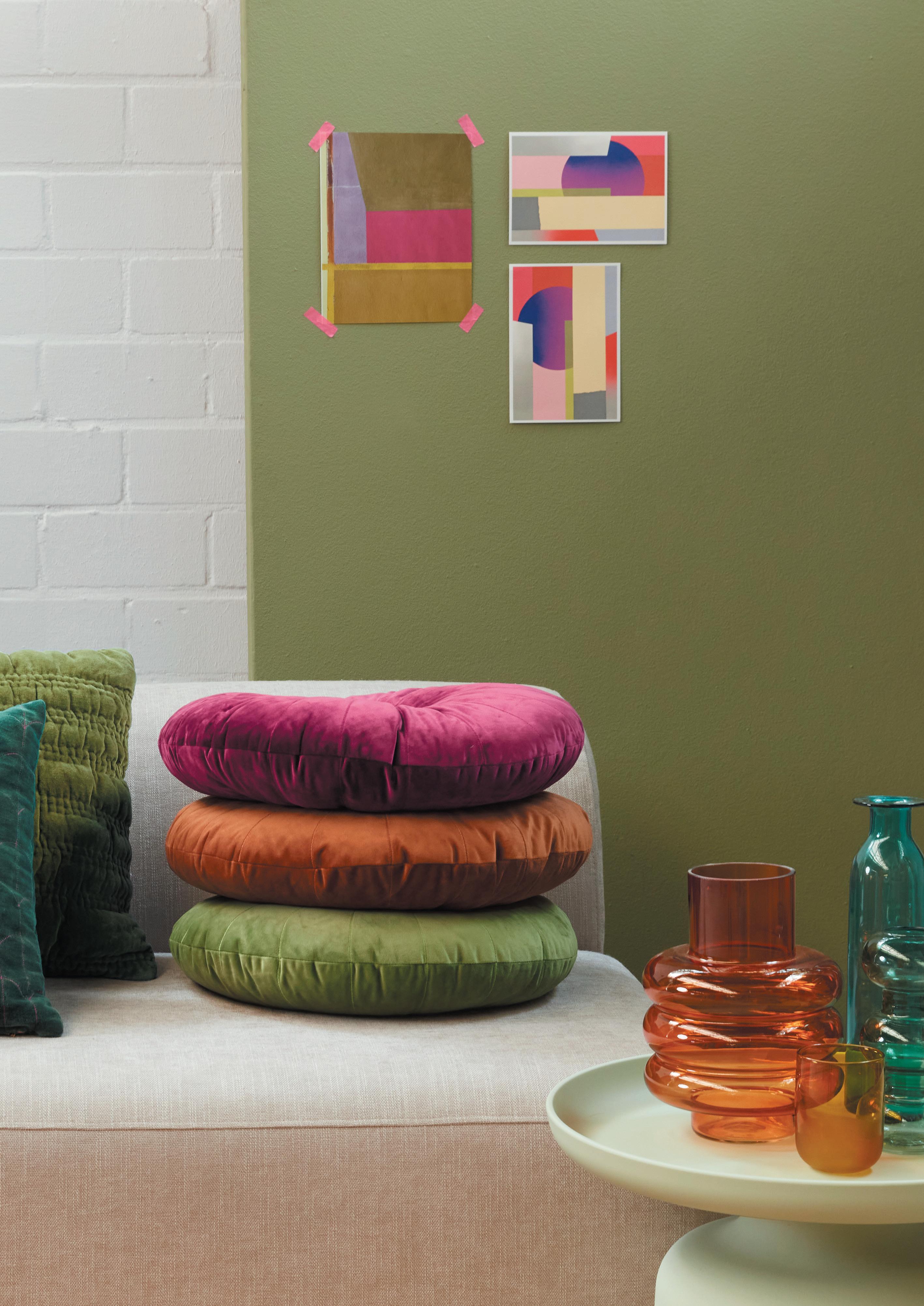 3. Advance Green 100% cotton. Uni dyed with tassels. 130x170 cm. 4. Mandarin Terra 100% polyester velvet. Tufted button in cushion centre. 40 cm