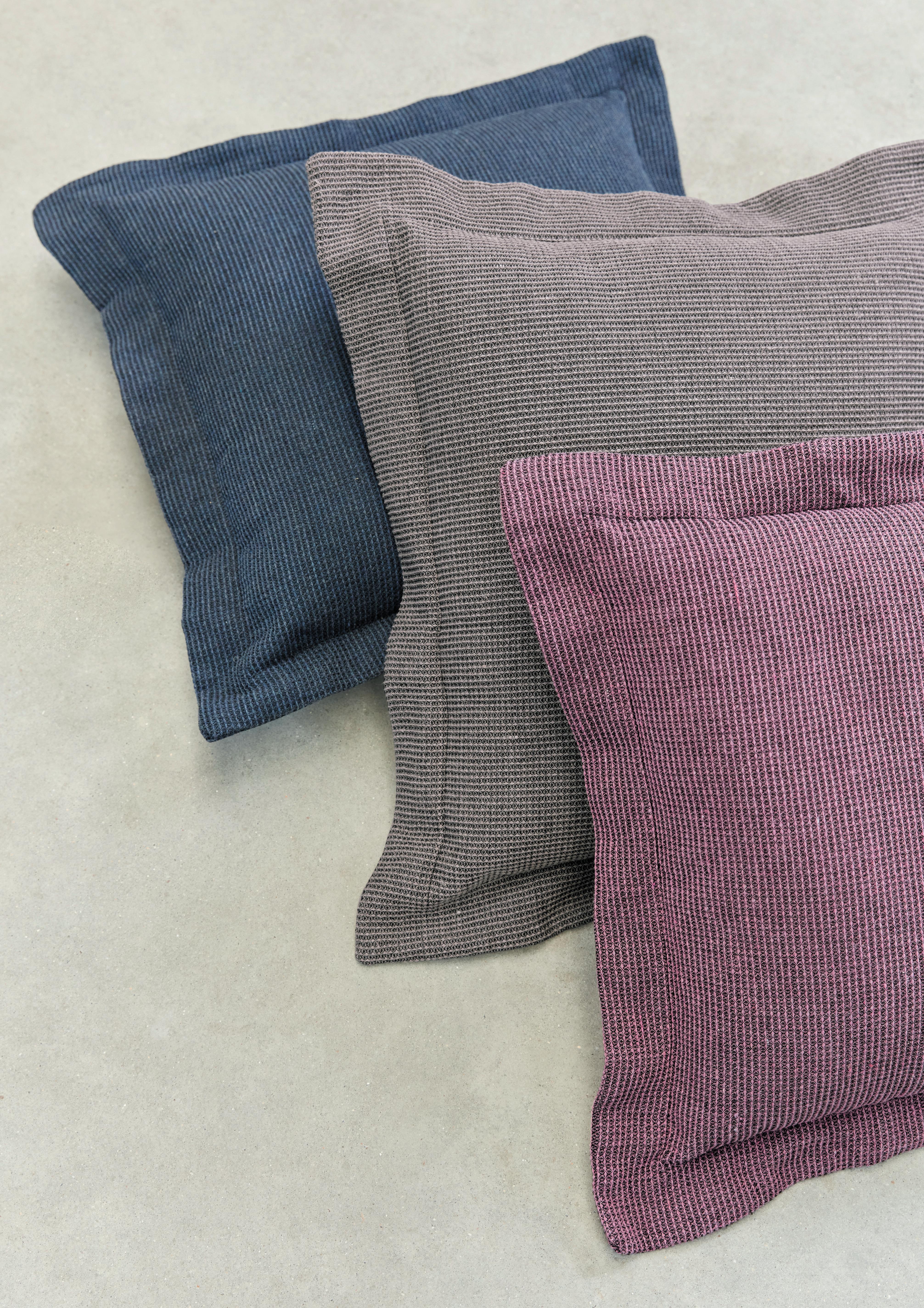 1. Emil Lila Made of 100% post-consumer waste. 50% acryl, 40% polyester, 10% other fibres. Woven waffle with oxford border. 43x43 cm.
