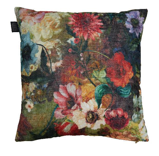 Front: 55% viscose, 45% velvet, cotton slub, back: 100% cotton. Digital print on front and uni dyed back. 43x43 cm.