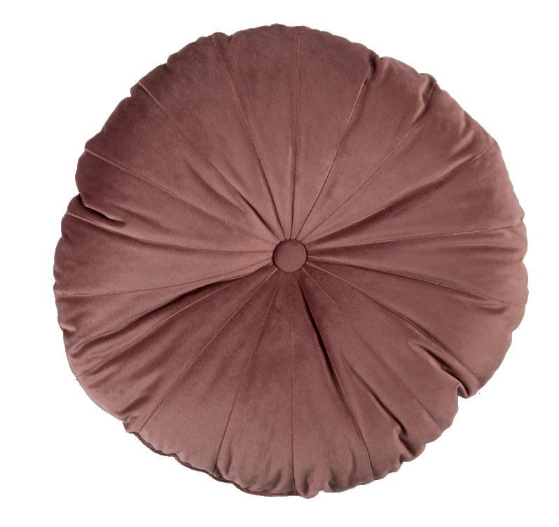 4. Mandarin Pink 100% polyester velvet. Tufted button in cushion centre. 40 cm.