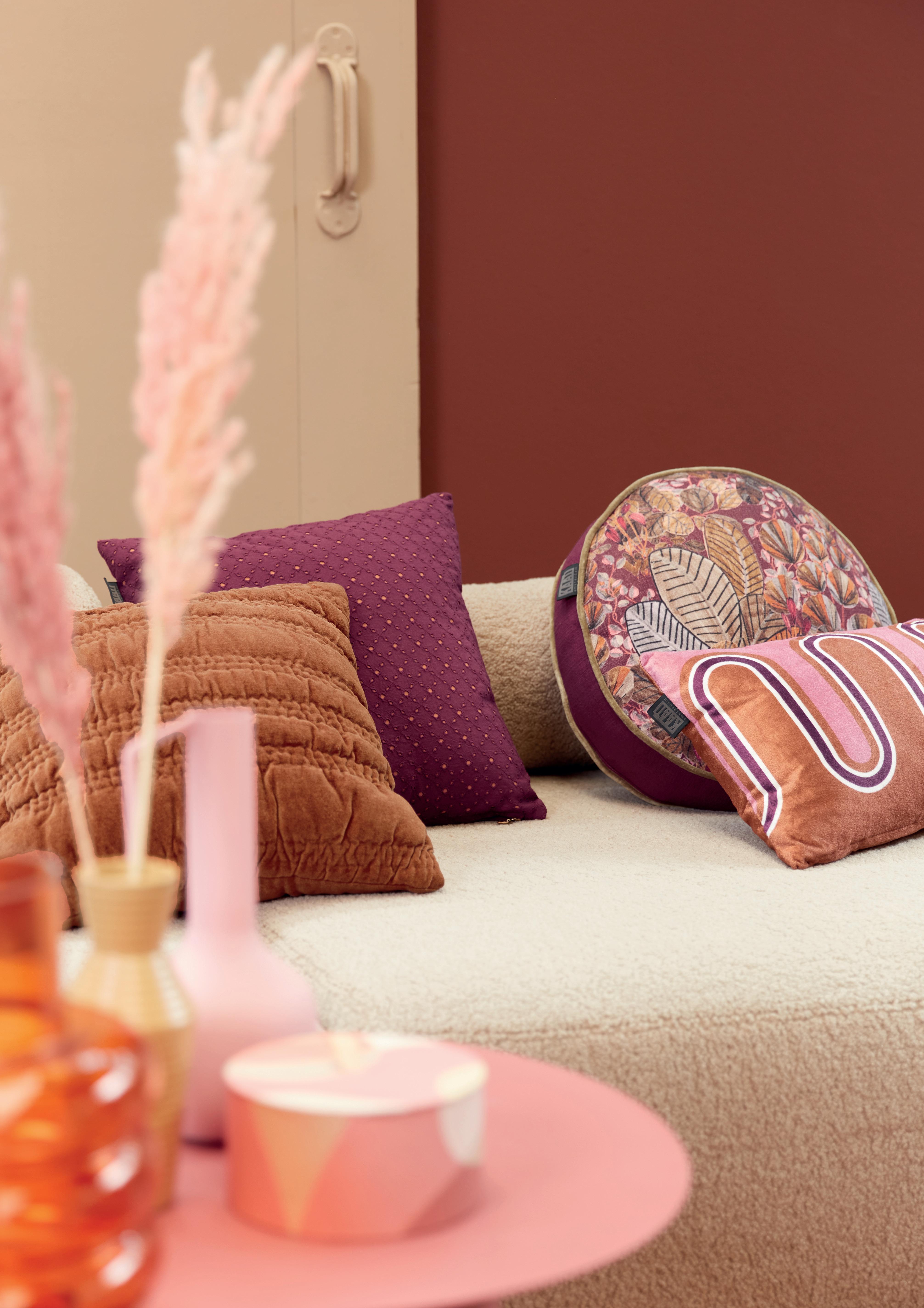 3. Advance Ochre 100% cotton. Uni dyed with tassels. 130x170 cm. 4. Mandarin Red 100% polyester velvet. Tufted button in cushion centre. 40 cm.