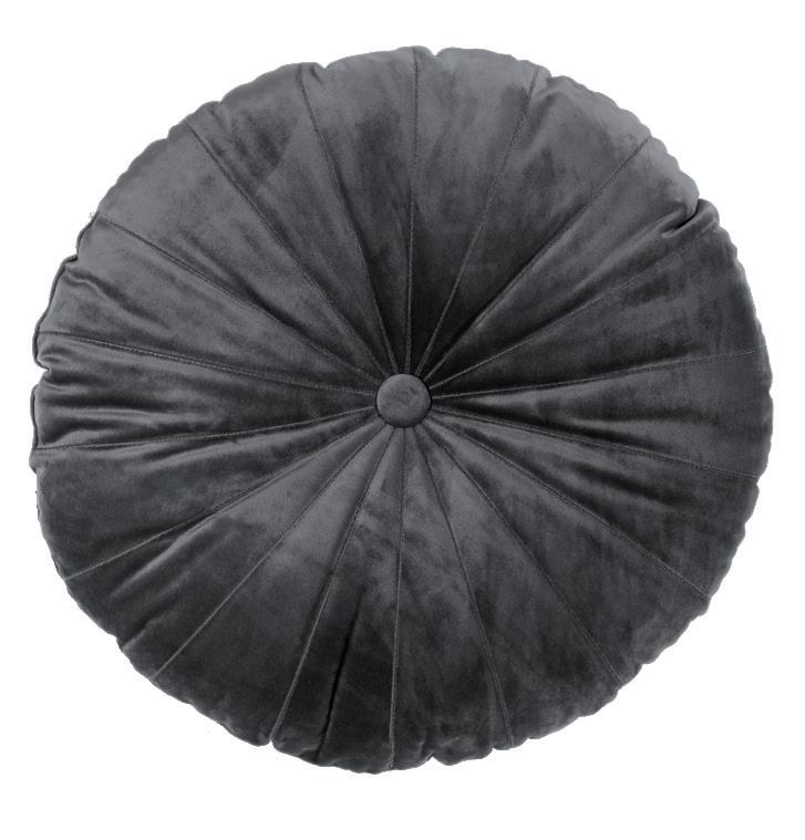 4. Mandarin Grey 100% polyester velvet. Tufted button in cushion centre. 40 cm.