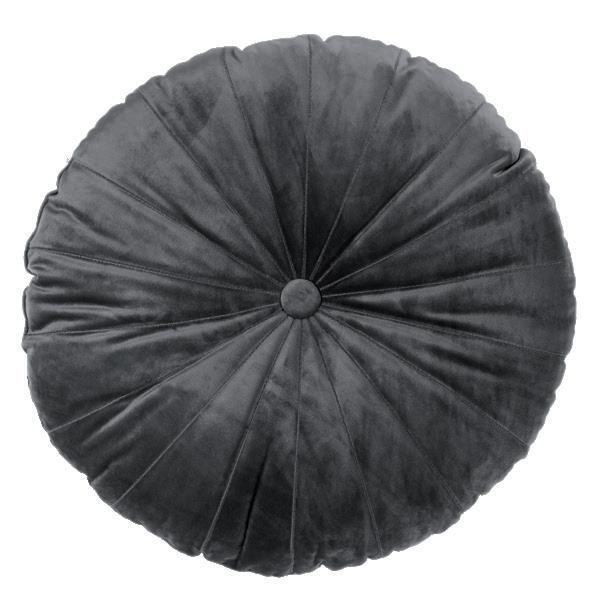 Mandarin Grey 100% polyester velvet. Tufted button in cushion centre. 40 cm.