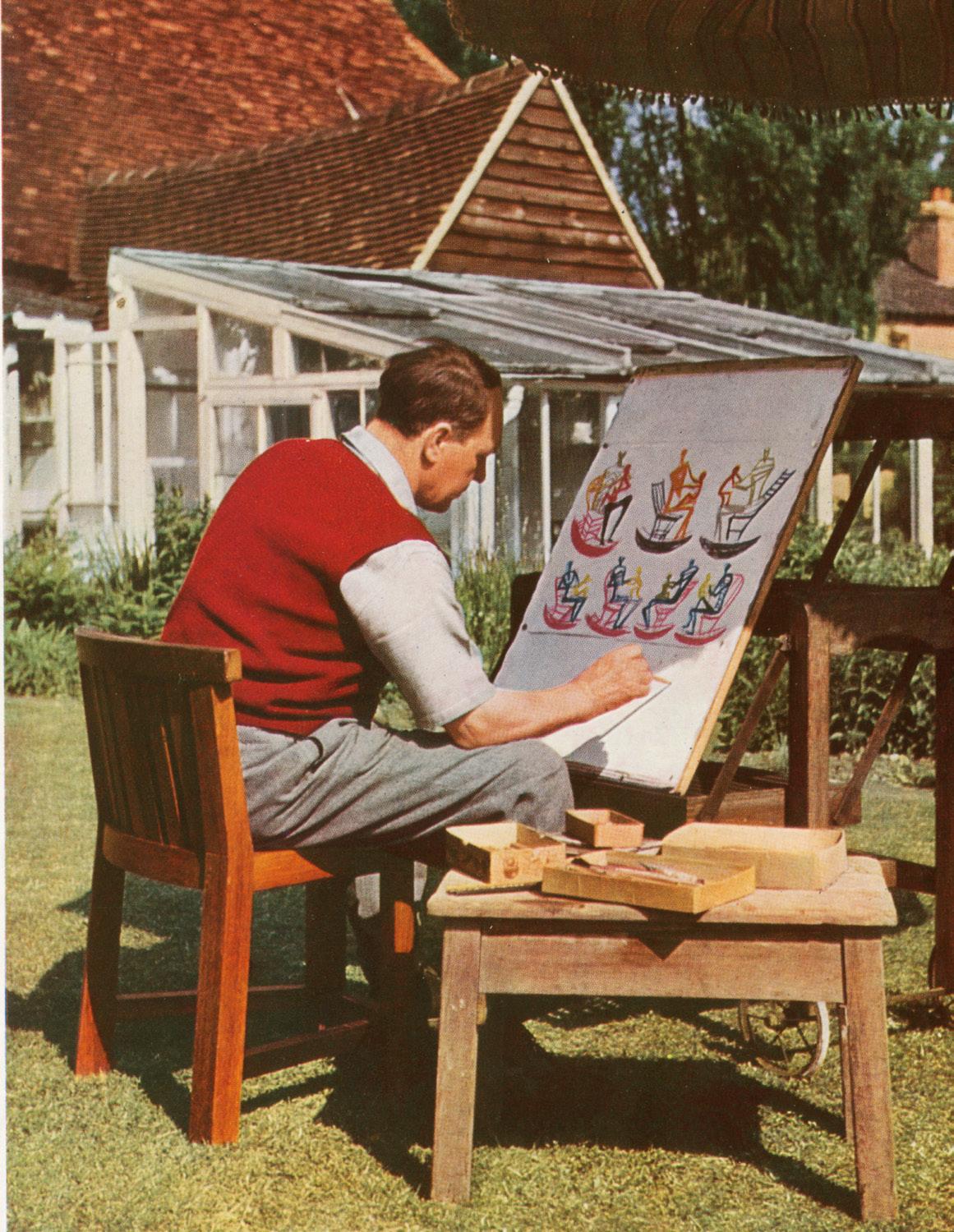 henry moore in zijn tuin, werkend aan zijn tekening Mother and Child in Rocking Chair, 1950