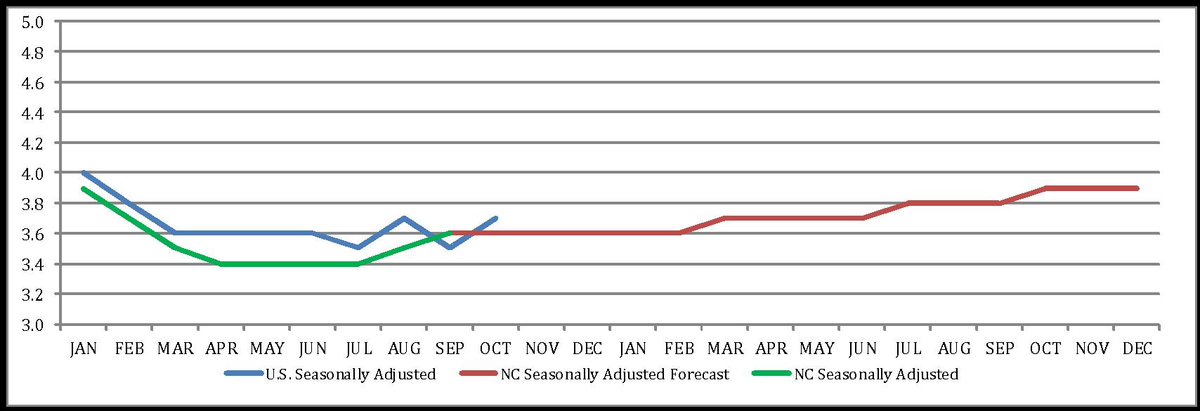 The graph at the top of this page provides a summary of the monthly unemployment rates for 2022 and 2023. The solid blue line represents the United States seasonally adjusted historic unemployment rate. The seasonally adjusted unemployment rate for North Carolina is represented by the solid green line. The North Carolina seasonally adjusted unemployment rate forecast is represented by the solid red line. The seasonally adjusted rates for the United States and North Carolina can be compared directly and provide more reliable estimates than the unadjusted rates.