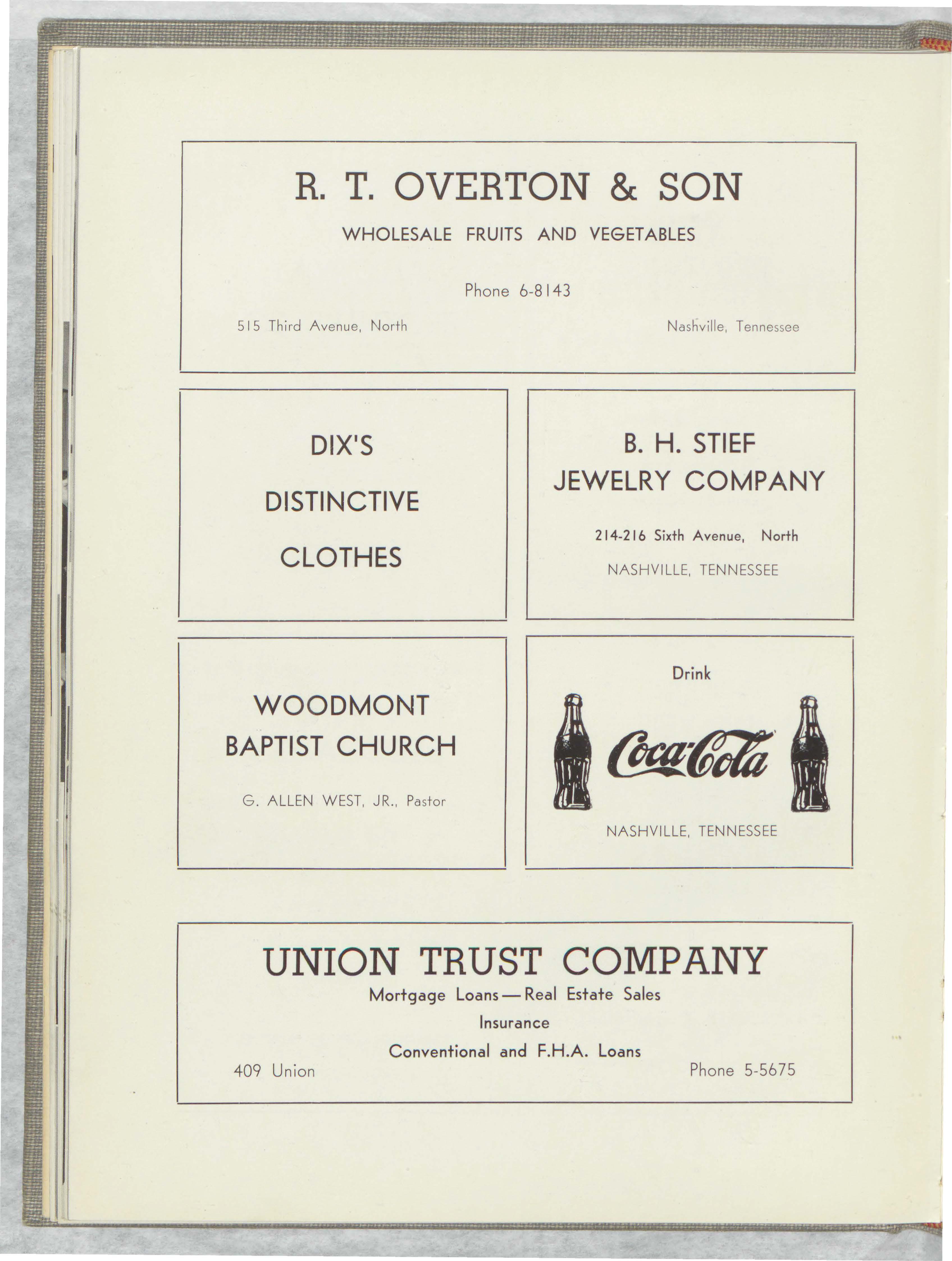 A graduate of Ward Seminary, she returned to Ward Belmont School to give nearly thirty years of untiring services in the bookroom, the Registrar's Office and in the bank. In 1951 when Tennessee Baptists took over the college, she became Hostess of Heron Hall, the boys' dormitory, and for two years was mother, nurse and private consultant to "her boys." Now she is school hostess and daily receives guests who may hear from her, as from no one else, Belmont's history and traditions.