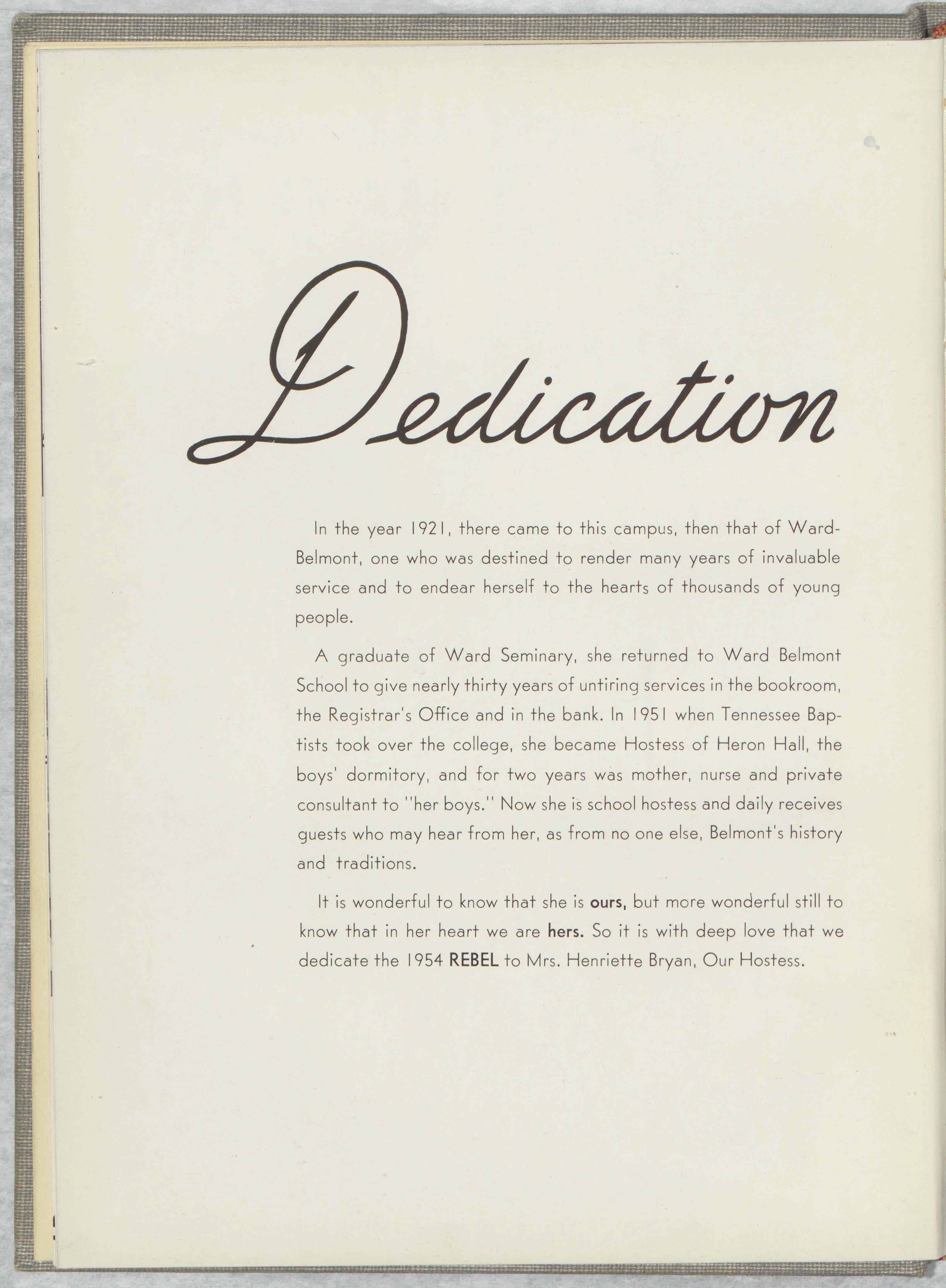 It is wonderful to know that she is ours, but more wonderful still to know that in her heart we are hers. So it is with deep love that we dedicate the 1954 REBEL to Mrs. Henriette Bryan, Our Hostess.