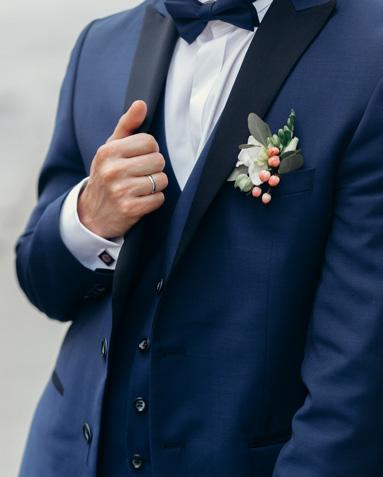 Modern tuxedo choices feature a slim fit in both jacket and pant. It’s a good idea to try on a few different options to see what feels comfortable before choosing a fit.