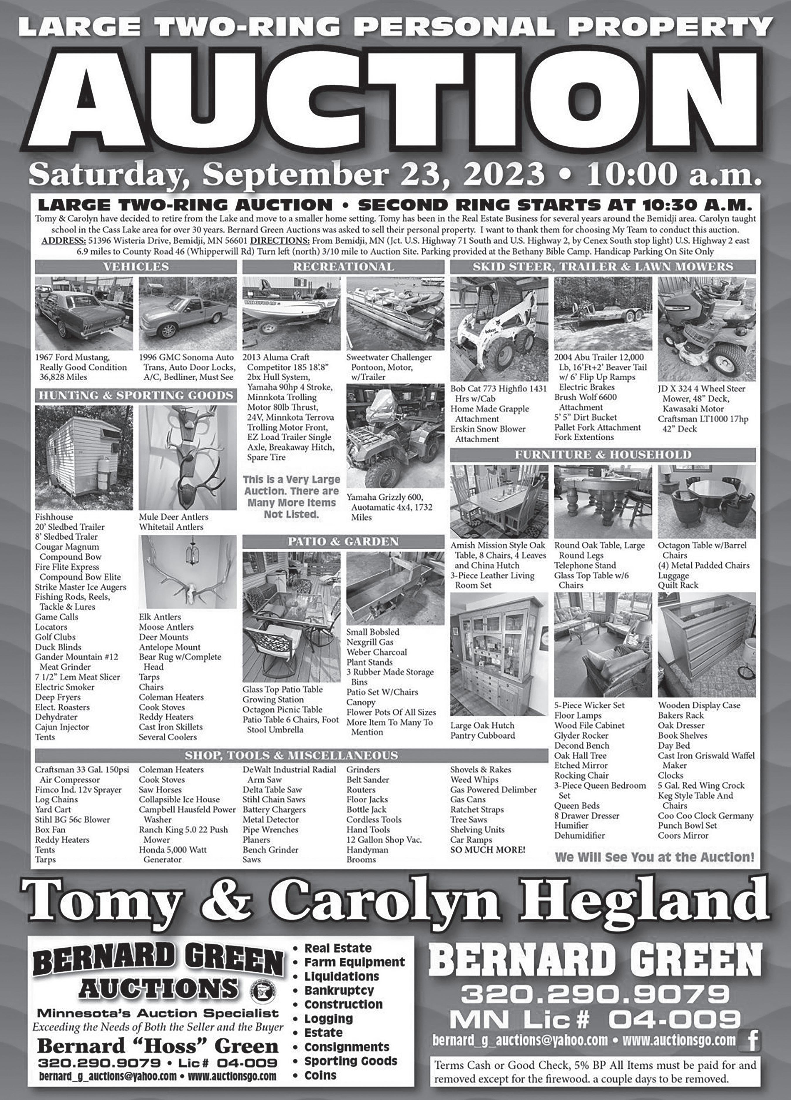 To conTribuTe news, sTories or phoTos, email: buyline@bemidjipioneer.com THE BuylinE SHoppEr | saTurday, sepTember 16, 2023 | A13 AUCTION SALES AUCTION SALES AUCTION SALES AUCTION SALES EQ UI PM EN T CO NS IG NM EN T Satu rday, Septem ber 23 , 2023 LI VE AUCT ION SA LE STAR TS AT 9:30 AM SH AR P at the Clea rw ater County Fa irgrou nds in Bagley, MN one mile north of HWY 2 on MN HWY92 - watch for signs AU CT ION TRACTORS, FARM & CONSTRUCTION EQUIPMENT 1969 930 Case Tractor, 7,302 hrs Mohawk 5ft Rotary Cutter 520 Belarus Tractor, Diesel JD 10ft Wheel Disc w. Hyd Cylinder Glencoe 12 Field Cultivator w. Mulch Drag, Hyd Cylinder AC 2 Bottom Pull Type Plow Oliver 3x16 Pull Type Plow w. Hyd Cylinder Ford 901 Tractor Wide Front D17 AC Tractor JD 4010 Diesel Tractor w. SyncroRange trans, 15-34 tires, wide front, Dual 3150 full hyd loader, QuickTatch bucket, bale spear, tach 6,318 hours Cab, fits 4010 Tractor Duals for 4010 Tractor Harley Rock Rake JD 700 Pull Type Chisel Plow 3pt EZEE Flow Broadcast Seeder 3pt Dearborn Single Disc MN250 Gravity Box MN Big 7 Gear NH 325 Manure Spreader Flat Rack on Running Gear Legend 4500lbs Pallet Forks Bobcat Mount Stout Bale Spear Bobcat Mount Stout 72in Grapple Bobcat Mount 3pt Sweepster Cement Mixer on Transport 8-Ton Wagon Cenex w. Hoist and Steel Box JD Four Wheel Manure Spreader on Steel VEHICLES, TRUCKS, TRAILERS, MOTORHOMES 1998 FourWinds 36ft Bumper Hitch Camper, two slides 1996 Ford F250 Diesel Pickup & Boss Plow Aluminum Pickup Tool Box Pro-Tech Pickup Headache Rack 1999 Dodge Dually Pickup Box 8 ft Aluminum Headache Rack w. Chain Racks & Clamps for Semi 10ft boss QuickTatch plow FARM MISCELLANEOUS, TOOLS, LAWN & GARDEN Over 30 Steel Wheels Marvel Metal Cutting Hacksaw Large Bench Vise Montgomery Wards Model 6 Slag Grinder Barrel of Oil Barrel Pump Anvil D7 Track Roller Tools Chain Hoists Come-a-longs Bearing Pullers Large Jack Large Wrenches Hardware Receiver Hitches ¾ Drive Socket Sets Chainsaw Air Compressor Cultivator Gangs w. Danish Tines 3pt 6ft Blade Hot Water Pressure Washer Barrel Stove & Cable Homemade Woodstove Webster Air Compressor Head Sears Nipco Heater Rustic Sled 3pt Post Hole Digger 8in Bench Grinder Locker Plant Meat Hangers Pulleys Screw Jacks Railroad Jacks Tractor Snow Bucket Bale Forks for Tractor 3pt Bale Forks Truck Tire & Wheel Misc. Truck Tires Fold Up Ladder Two 12.4x24 Tires and Rims for B or C Allis Chalmers Two 500x15 Front Tractor Tires Four 26575R16 Tires and Rims Tecumseh 10hp Engine Shaft Portable Air Tank Tractor Muffler This ad only represents items consigned by the advertising deadline. To view an up-to-date list & photos visit our Facebook page. Items added daily. Many more consignments expected. Auction Company reserves the right to turn away any items, multiple rings, items subject to prior sale. Free loading/unloading available, items may be inspected throughout check-in period. All items must be removed by September 25th. Please call with questions. TERMS All pu ha st be pa id in fu ll th day of ction befo it be d fr ctio site Paym ts epted sh good ch k, jo dit rd with 5% fe Ite being ld “A S IS WH ER E IS ”, with gu te ti Wh il d ipti beli d to be t, th ction mp y will t be held sp sibl fo ad rtising di rep cy ina y to th ge in s, aut henticity, defect of y it in print rbally Stat ts de by ctio ctio day ta ke pr ed y pr iously printed terial On th ction ys “S OL D” th buye is th le d ponsibl fo id it Sa les ta will be ch ged rding to MN state gu idel in NO BU YE RS PR EM IU M. ON SITE CH ECK-IN SE PT 15th - 21st 8: 00 am - 5: 00 pm All Titled Vehicles & Trailers MUST be Consigned and On-Site by 5:00 PM on Wednesday, 9-20-23 CL ER K Follow us on Facebook! Ed Gregor y 61 2-28 2-5702 MN LIC #7 2- 04 Dave Gregor y 21 8-76 6-7423 MN LIC #1 5-13 Je ff Johnson 61 2-490 -2 38 7 edgregor yauctions@gmail.com TREE SERVICE/ STUMP REMOVAL Kolstad Tree & Shrub Care ISA Certified Arborist Free Estimates Call 218-444-4282 WELDING Precise Mobile Welding LLC I come to you Aluminum-Stainless Steel Steel and Cast Iron Farm and heavy equipment Boat lifts and docks Prices by time & material Allan 218-368-1760