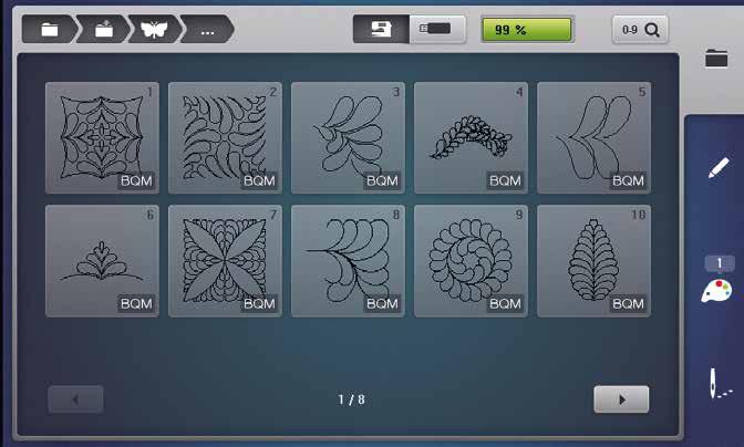 Quilting como um PROfissional. Os novos desenhos de quilting personalizáveis (.bqm) trazem para a sua máquina de bordar a funcionalidade do quilting profissional com braço longo. Possibilidades ilimitadas de escalonamento, a capacidade de modificar os pontos por polegada (SPI) e as funções melhoradas de remate de quilt permitem-lhe obter um quilting computorizado perfeito na sua máquina de bordar.