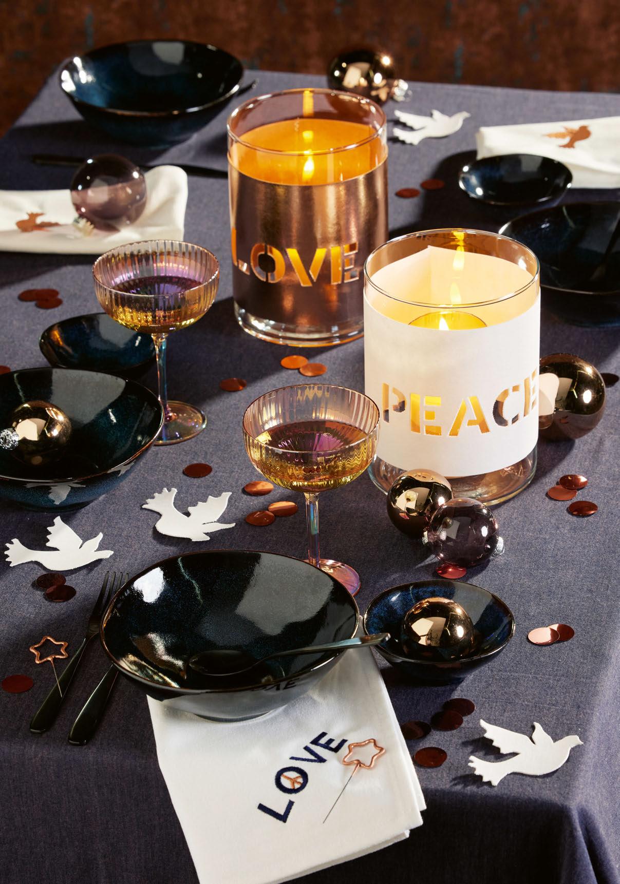 Weihnachtliche Stimmung mit Windlichtern, bestickten Servietten und friedlicher Dekoration in Taubenform
