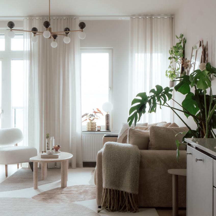 This bright and inviting apartment is a harmonious blend of function and aesthetics, where every detail contributes to a sense of welcome and balance. A generous beige sofa forms the heart of the room, inviting relaxation and togetherness, while chairs upholstered in soft lambswool add warmth and a cozy texture.