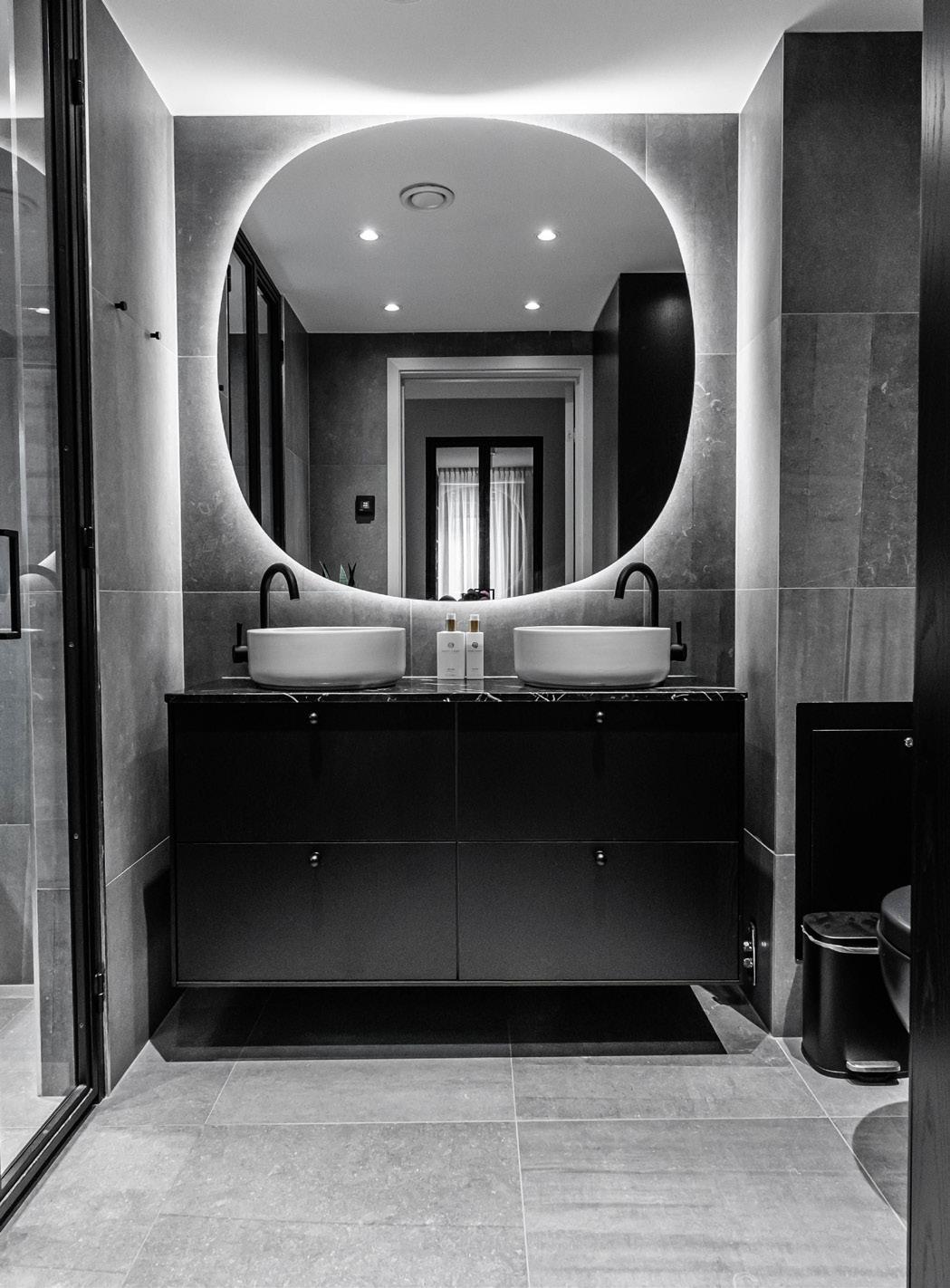 The story continues in the bathroom. Black fixtures against gray surfaces create a graphic serenity – every detail thoughtfully considered, every choice deliberate. A space for relaxation, energy, and everyday luxury.