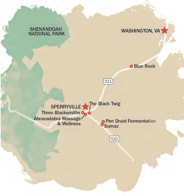About a mile from Sperryville’s main drag, you’ll find Pen Druid Fermentation (pendruid.com) just off of Route 522/Sperryville Pike, with its sweeping countryside views and a rotating selection of beers and ciders on tap, plus a bin with natural wines from D.C.’s Domestique. Check the brewery’s Instagram (@pendruidbrewing) before visiting and try to plan your visit when Sumac (sumac-va.com), the wood-fired kitchen out back, is serving small plates from its “wildly local” seasonal menu.