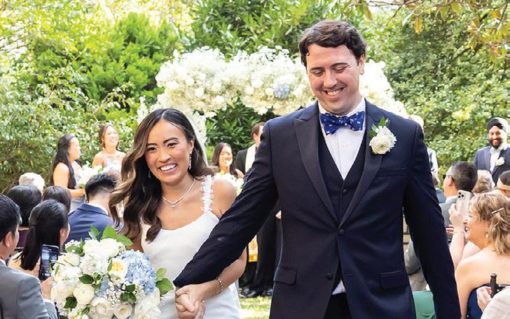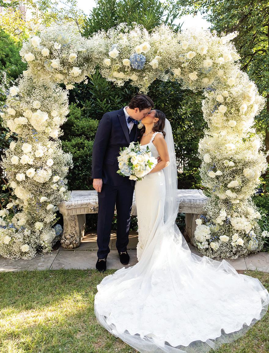 loved the idea of being able to do our ceremony outside, because we spend … so much time outside as a couple,” Kathleen says. The property’s East Garden, an alcove bursting with lush greenery, proved the perfect environs for their 124 guests to watch them say “I do” on the sunny Saturday. As the couple walked back up the aisle as husband and wife, a duo of string musicians played “Africa” by Toto—a favorite song of theirs.