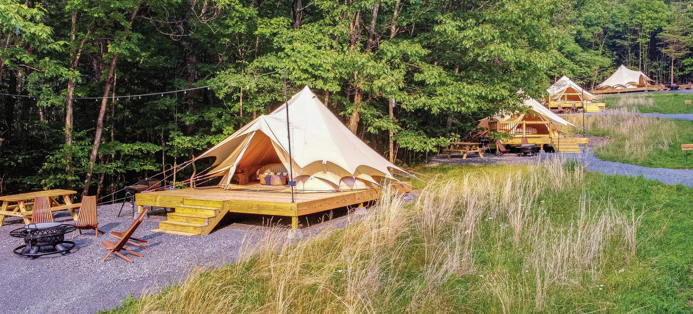 While Wi-Fi is available for all tent sites, along with a power station for charging phones, cell service is limited. Outdoor solar string lights give off a nice evening glow. Special “family glamping experience” weekends (July 7-9 and 21-23, and Aug. 4-6 and 18-20) feature forest bathing with a naturalist, telescope stargazing, a campfire masterclass, a farm-to-fire meal with grass-fed meat and s’mores, and a choice of adventures that range from a horseback trail ride in Cacapon Resort State Park to a soak in mineral springs at the Old Roman Bathhouse in Berkeley Springs State Park. Glamping season runs from mid-April to midNovember. Nearby Berkeley Springs is home to restaurants and breweries. Rates begin at $170 per night, $895 for the two-night, three-day family glamping experience.