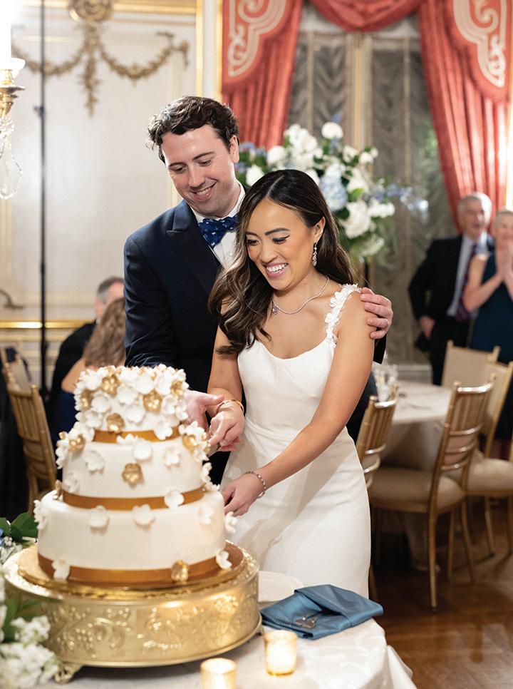 The outfits: Kathleen picked out her fit-and-flare Kelly Faetanini gown from The Bridal Room in McLean, Virginia, on her first day dress shopping. “[It] had really beautiful floral decals on the train of it, which is what sold me,” Kathleen says, and she had the straps and her veil customized to match. She also wore a sapphire and diamond bracelet from her grandmother (her “something blue”) and a ring (her “something new”) that James’ parents gifted her during the traditional Vietnamese tea ceremony the couple held about a month before the wedding to honor Kathleen’s cultural heritage. James, meanwhile, opted for a blue-toned tuxedo and bowtie to complement the azure florals.