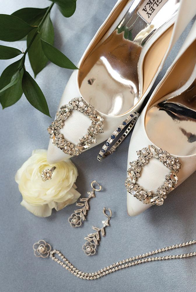 periwinkle candles decorated the central king’s table, and the other tables boasted elevated centerpieces with powderblue hydrangeas and pearly baby’s breath that appeared to float midair. Personalized luggage tags guided guests to their tables, which were each assigned a locale the pair had visited together. In place of a traditional guest book was a white Adirondack chair—destined for the couple’s porch at home—