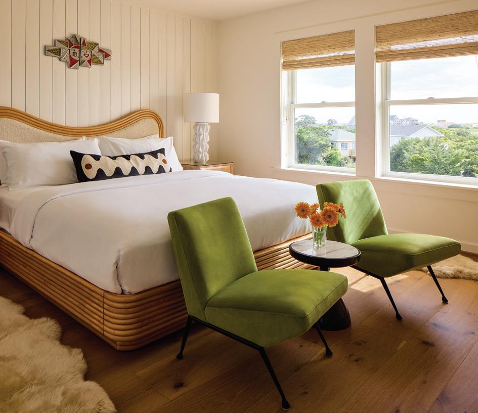 Begin and end an active day in coastal-chic luxury at Pamlico Station Edgecamp, a hotel that opened in 2024 overlooking Pamlico Sound on Hatteras Island in North Carolina’s Outer Banks. The windswept barrier island, known for its maritime history, is roughly 30 miles from the site of the Wright brothers’ first flight. It’s also a haven for surfers and kitesurfing enthusiasts. Jonathan Adler, renowned interior decorator, potter and author of 100 Ways to Happy Chic Your Life, was tapped to create Pamlico Station’s swanky-casual vibe.
