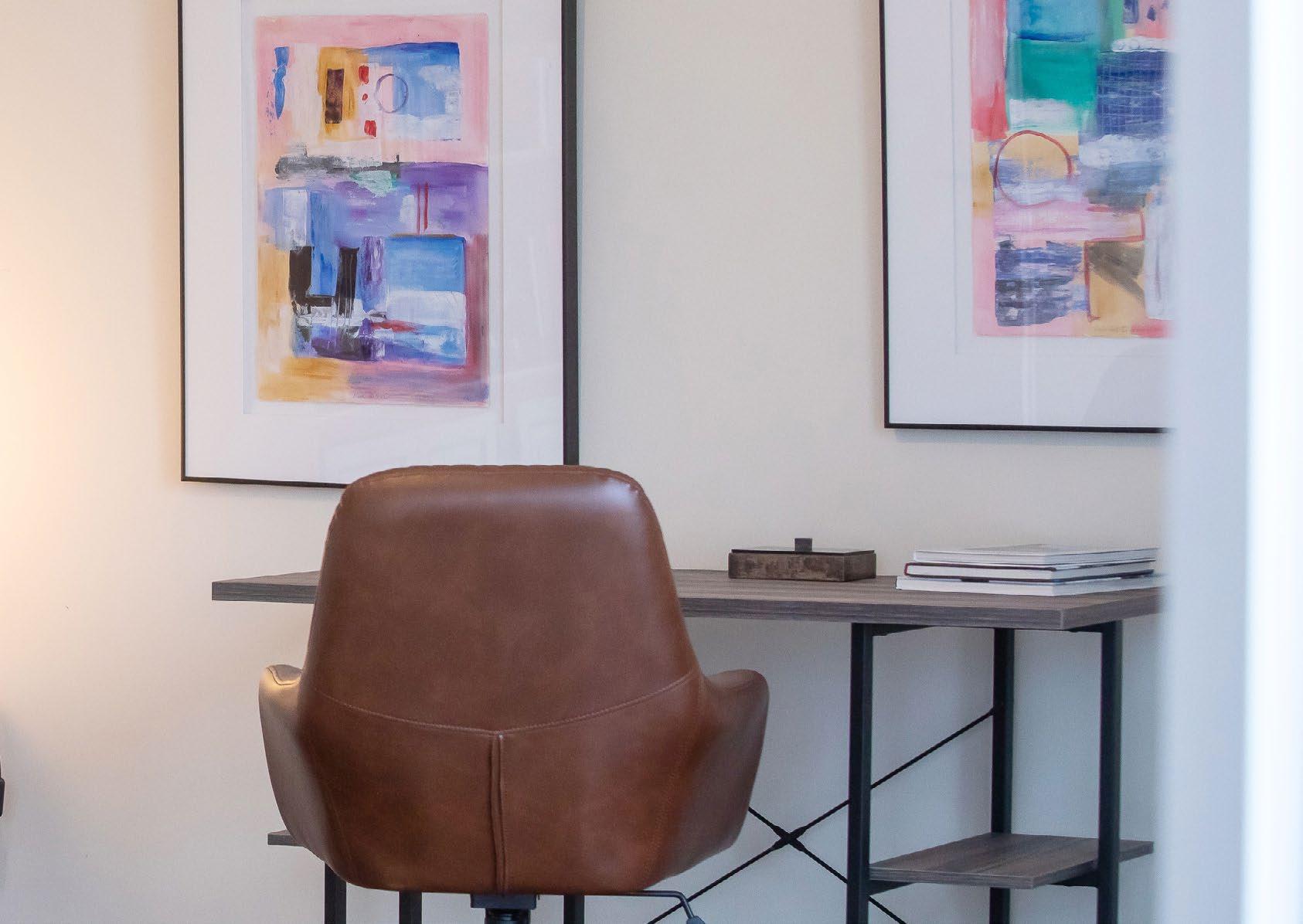 Neben vielen Annehmlichkeiten in den einzelnen Räumen ist das Dachgeschoss-Appartment mit ausgewählten Kunstwerken ausgestattet. Auch der Arbeitsplatz ist ein bauliches Unikat - ein Zusammenspiel aus Klassik und Moderne. Neben der richtigen Arbeitsatmosphäre erwartet Sie ein luftiger Ausblick, der hilft, tief durch zu atmen und die eigenen Gedanken zu Höhenflügen anzutreiben.