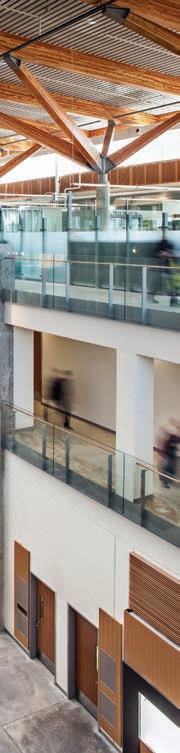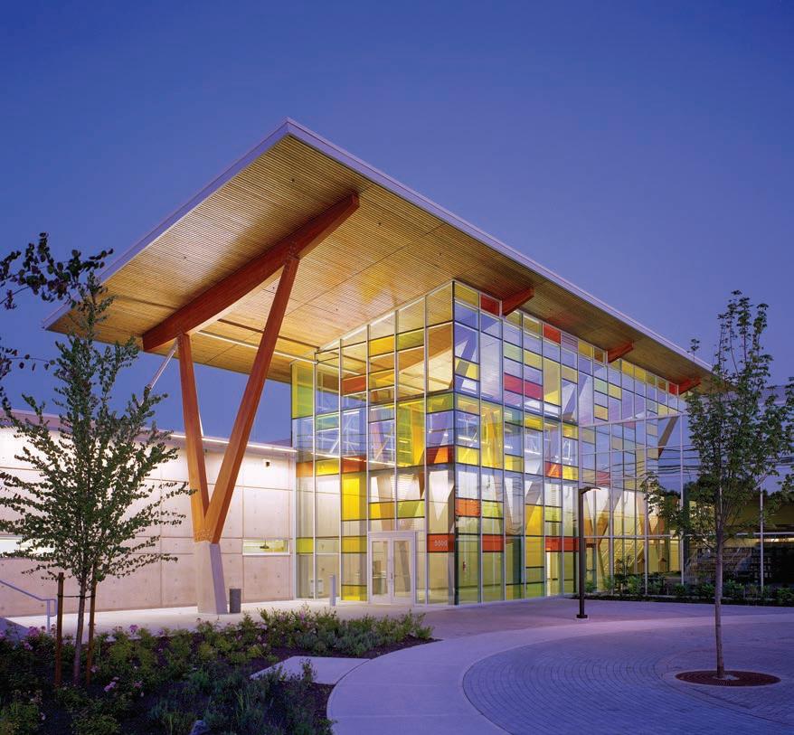 This signature building creates a new gateway to Kwantlen Polytechnic University’s high-tech facility for trades, technology and applied training programs. The facility provides direct connectivity and views to the outdoors, which is predominated by an indoor ‘covered street’ which provides visual and physical access to every floor and ensures optimum natural light and ventilation. The atrium features an expressive double height glu-laminated structure and a series of skylights which allow natural daylight to illuminate the space which is augmented with multi-coloured glazing. The celebration of craftsmanship is put on display throughout the facility to further enhance the learning experience for students. The centre’s anticipated 30% (approximate) savings in energy usage is sufficient to power 19 typical Vancouver homes annually.