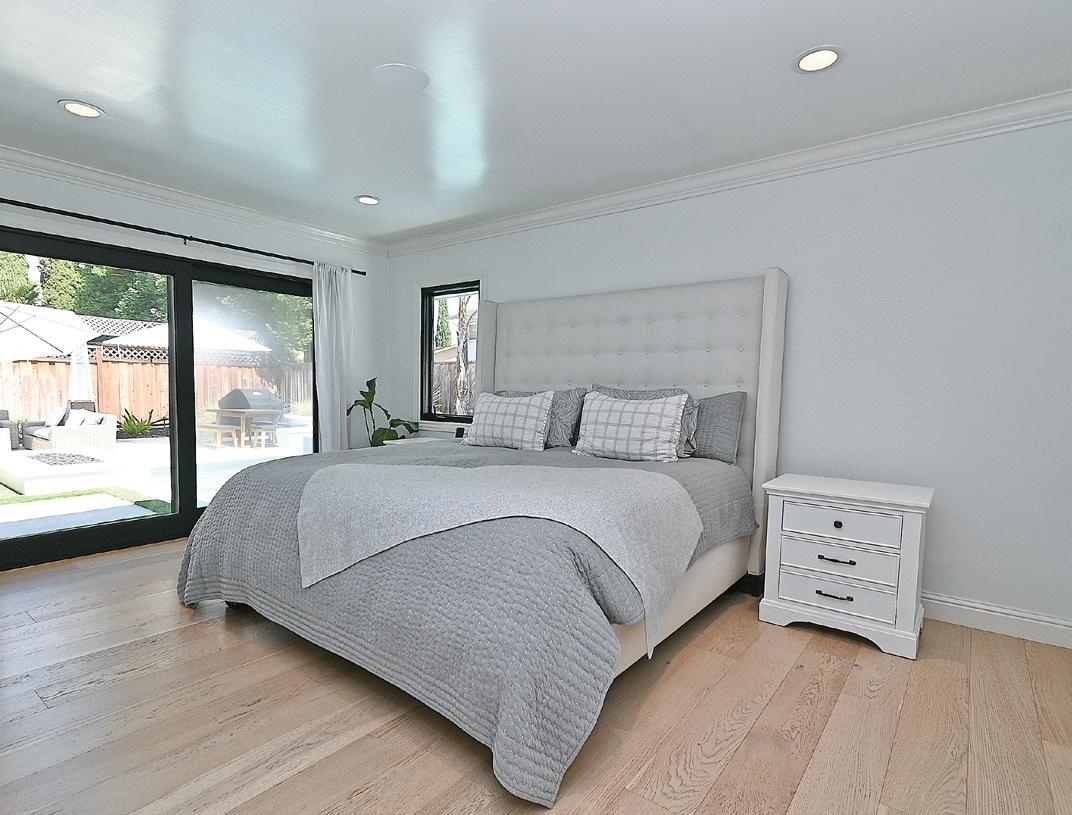The raised ceilings with structural beams and an 18’ glass wall enhance the spacious living and dining areas, seamlessly connecting the indoor and outdoor spaces. Elegant touches such as new engineered hardwood floors, crown molding, and Restoration Hardware chandeliers add to the luxurious feel.