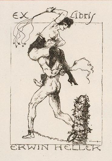 Severin Wigerts exlibris föreställer en naken man som vänder ryggen mot två grupper: dels ett kors vid vars fot en liten mansfigur slingrar sig, dels en sfinx vars ena, jättelika bröst omfamnas av en mycket liten man. Temat är nietzscheanskt och homoerotiskt: huvudrollen spelas av den frie mannen som förnekar såväl kvinnans/moderns inflytande som den kristna traditionens självförsakelse och undergivenhet. Överskriften är radikal: ”Non serviam” – ”Jag tjänar inte”. Det kanske inte var så konstigt att Wigert hade ett starkt intresse för Strindberg. Kristendomskritik, misogyni, homoerotik, positivism, opera och pornofili – se där ett ytterst fascinerande andligt kluster som pockar på en grundlig idéhistorisk utredning, men det här är inte dess plats. Vid mitten av 1920talet testamenterar Borgström allt han äger, bortsett från erotican, till Wigert.41 Denna gest besvaras inte – Wigerts testamente är helt till broderns förmån. Arbetarklassmannen Borgström får stå för den skamliga uppgiften att vara donator av de erotiska böckerna och konstverken. Den högborgerlige Wigert bevarade sin ära. Vågar vi anta att de båda samlarna var älskare? Det verkar inte orimligt, men återstår att bevisa. Vad vi har är två originella män från olika samhällsklasser, två ogifta outsiders som under en period bodde ihop och som förenades i sin kärlek till opera och erotica.