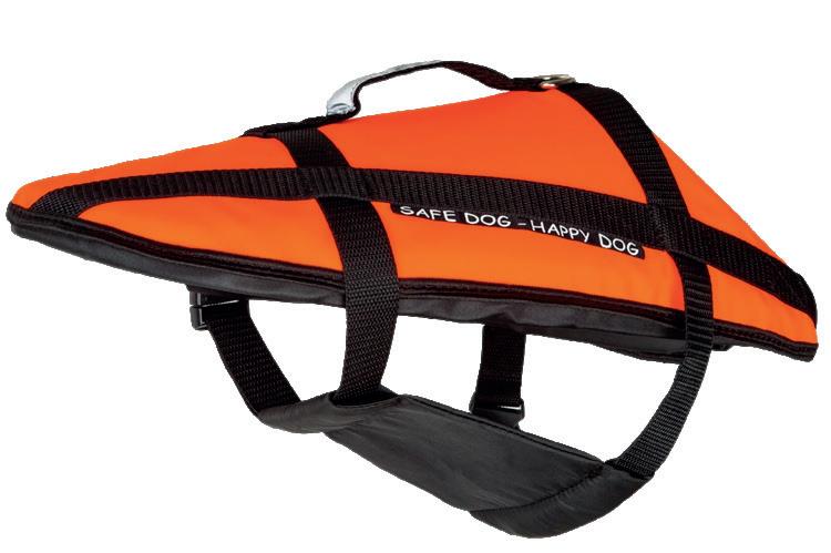 Gilet de sécurité canin, coloris orange, usage en bord de mer, rivière ou lac. Bandes réfléchissantes, boucles positionnées de manière à ne pas emmêler les poils du chien, la poignée sur le dos permet un portage aisé.