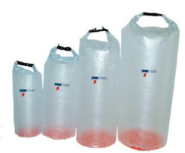 Sac étanche PVC armé transparent, 580 grammes/m2, fond rond, fermeture par clip rapide. 32 L avec 1 sangle bandoulière. 64 L avec 2 sangles bandoulière. Etanche à l’aspersion.