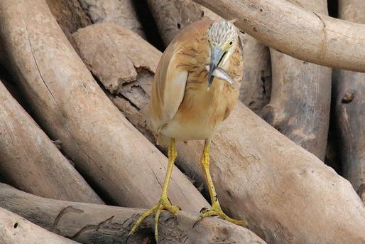 The Squacco Heron is one of the smallest members of the heron family. It is a stocky bird with a long bill, short neck and legs. On the ground, the bird blends very well with the surroundings due to its buff brown breast and back, but in flight it totally transforms due to its striking pure white wings and tail. As with most other birds, the adult plumage changes during the breeding season . The breast and back turn from buff brown into a peachy-pink colour, its cream-coloured head attains fine black streaks and long white and black-edged plumes appear on the hindneck. These plumes are synonymous with herons and egrets during the breeding season. The bill also takes a conspicuous bluish colour with a black tip.