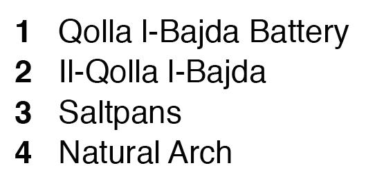 Sandwich Tern are guaranteed. Back on the trek, the route now turns inland with open fields dominating the scene, where autumn migrants like Eurasian Skylark and Common Stonechat can be encountered. One can opt to walk down the steep stairway to the idyllic Wied il-Għasri beach for a quick photo of this most “Instagrammable” location.