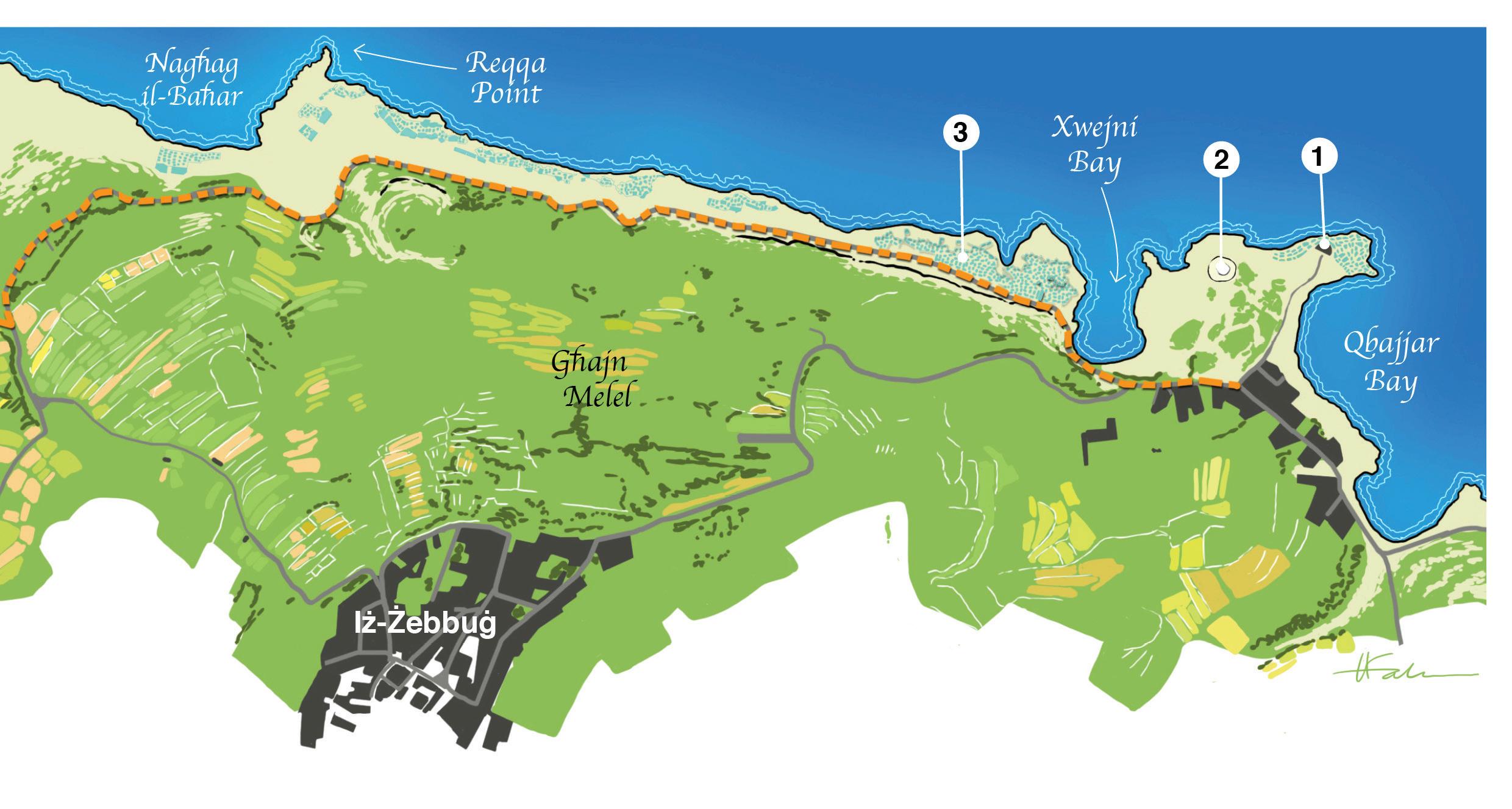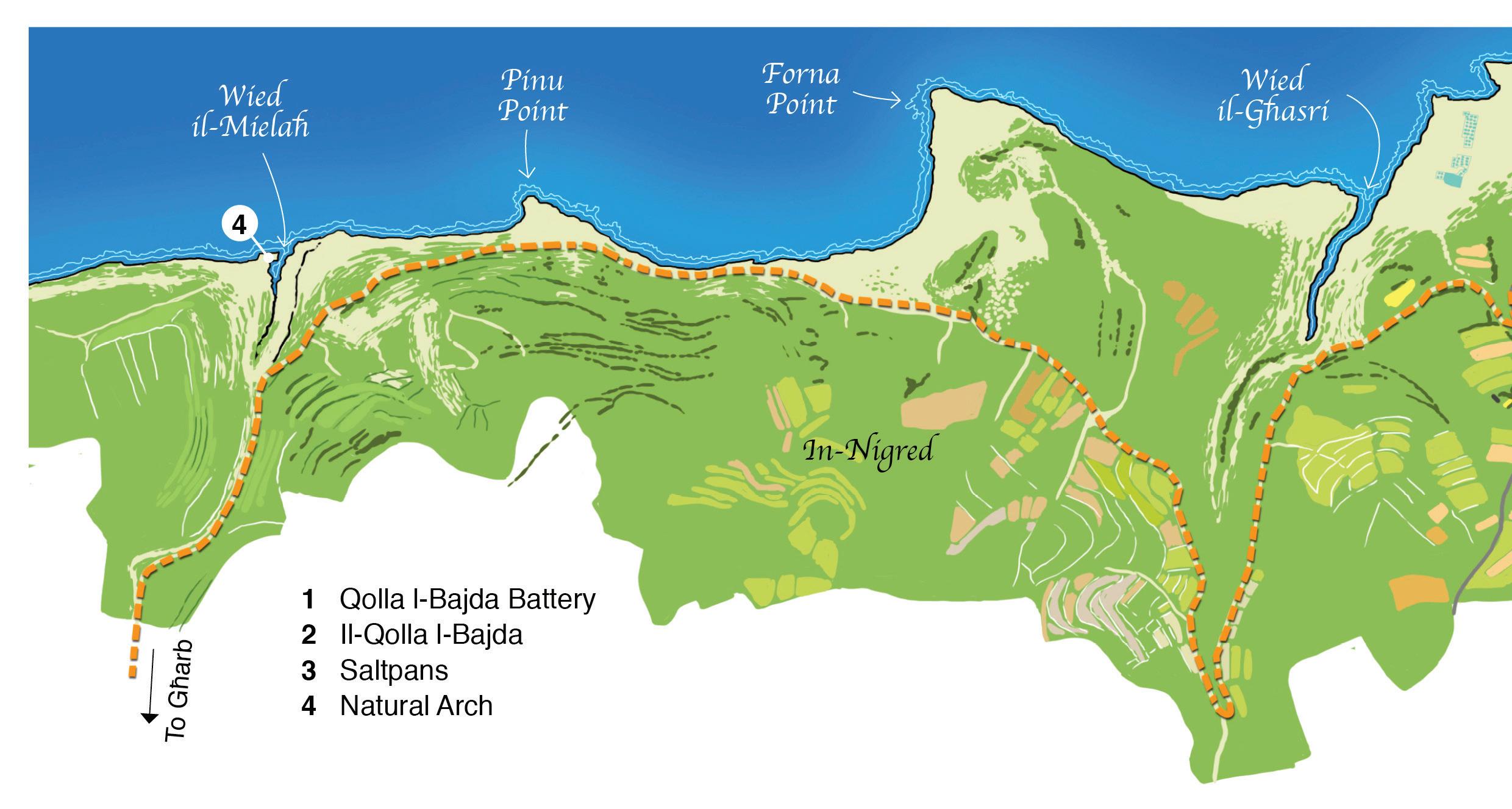 The northern coastline of Gozo was chosen for this autumn walk, starting from Qolla l-Bajda “The White Hillock” which is located between Qbajjar bay and Xwejni bay, a geographical symbol of this part of the island. An easy coastal walk takes you from here to Reqqa Point, then swerves around Wied il-Għasri and concludes in Wied il-Mielaħ. This walk can take around two hours, with another 30-min hike to the village of Għarb where public transport is available.