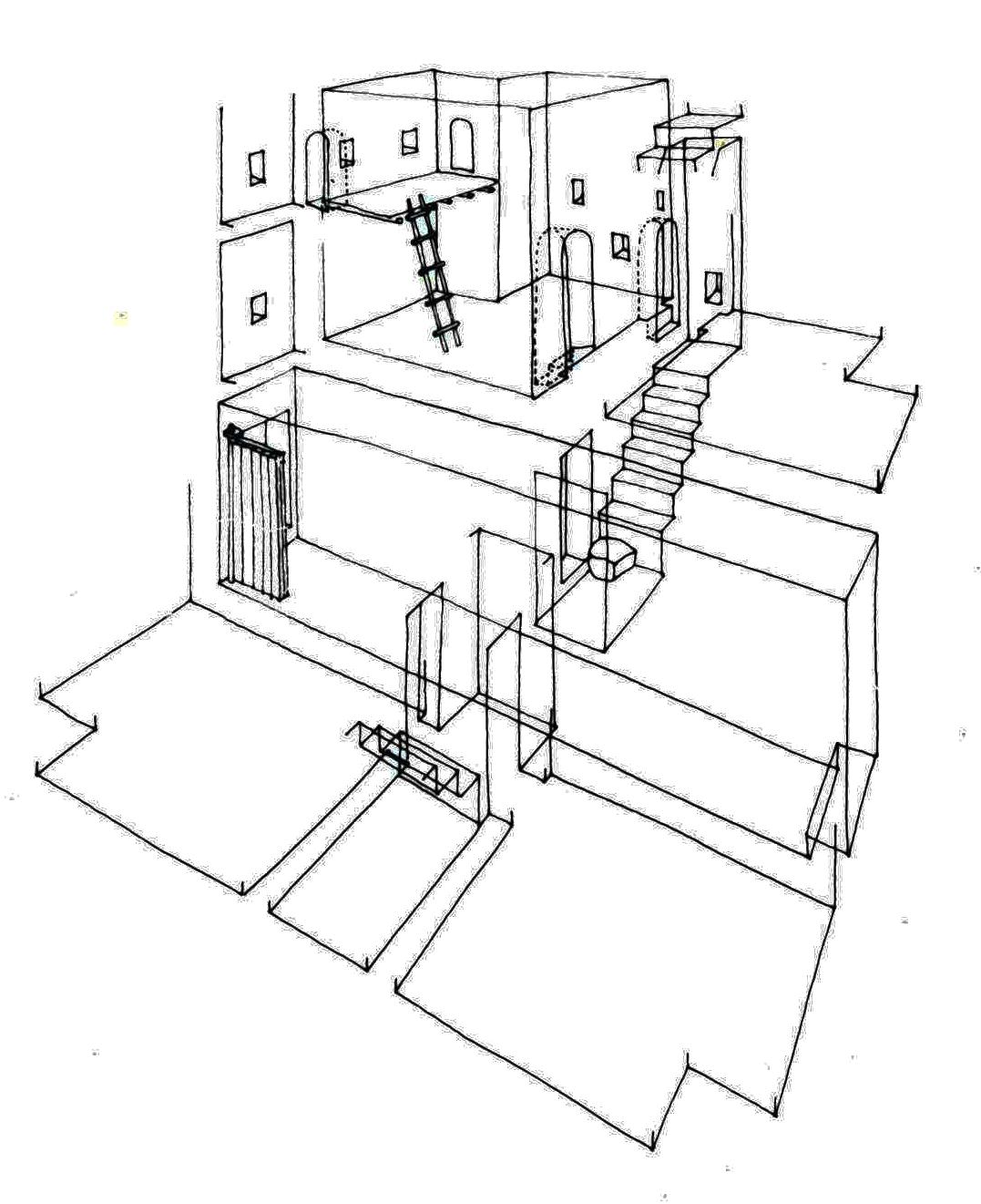 cher Dichte errichtet. Die Räume empfingen Luft und Licht aus einem Hof, dessen Lichtöffnung stufenlos geöffnet werden konnte. Er war an einer oder mehreren Seiten umbaut. Jedes Haus besaß eine Dachterrasse. Sie war ein wichtiger Wohnraum im jahres- und tageszeitlchen Nutzungswechsel. Im Sommer hielt man sich tagsüber in der schattigen Kühle des Hauses auf. Nachts schlief man auf der Terrasse. Kühlende Winde minderten die Hitze. Im Winter verbrachte man den Tag in der wärmenden Sonne auf der Terrasse, die Nacht dagegen geschützt vor der Kälte im Haus. Dieses Reagieren auf das Klima im Rhythmus von Tag und Jahr war eine kluge Ergänzung baulicher Maßnahmen durch Fllexibilität in der Nutzung, die kaum eine Spezialisierung einzelner Räume zuließ. Ausnahme war die Küche, die es oft sowohl im Haus als auch auf der Dachterrasse gab. Das Erdgeschoss war Haustieren und Lagerräumen vorbehalten. (Zeichnung: Umbauung an 1,2,3,4 Seiten, Bild im Ksarhaus)