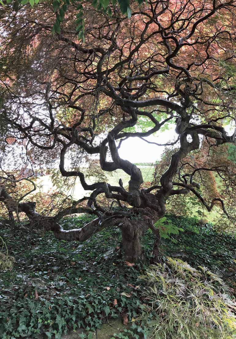 (Iris kaempferi), Chinese reed (Eulalia), and hostas (Hosta), among other plants. In addition, there were Chinese autumn anemone (Anemone hupehensis var. Japonica), Japanese flowering cherry (Prunus serrulata), summer lilac (Buddleja davidii), Japanese kerria (Kerria japonica), Asian flowering dogwood (Cornus kousa), threadleaf Japanese maple (Acer palmatum ‘Dissectum’), and the silver variegated ash maple (Acer negundo ‘Variegatum’), which, although not native to East Asia, has a similarly picturesque character.