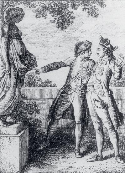 distance. Folio 8 (fig. 8), by contrast, shows the same two gentlemen engaged in an animated conversation, and while one of them is actually poking his right index finger between the folds of Flora’s dress laden with the fruits of the field, his interlocutor is so captivated by the stone figure that he has thrown up his arms as if in fright. Chodowiecki contrasts the unbridled, overly intimate appreciation of art through visual contemplation, animated discussion and touch with the new etiquette of decorous restraint that allows silence and the sense of sight to rule supreme.89