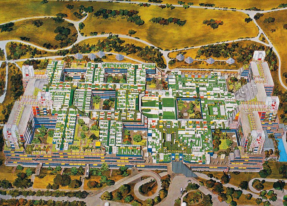 The architects have always insisted that they did not develop a building, but rather a structure, because the building is constructively expandable in all directions and completely flexible in terms of its uses. The diagram associates a city or maybe a machine, but perhaps these references are insufficient limitations. It is a very large and flexible structure. This freedom to change and adapt to any use was not just a promise of young architects or a general wish at the time, but it actually works, is still practiced today, and is not just a matter of moving a few walls! Institutes become patient rooms and seminar rooms become treatment rooms. A few years ago, a completely new open courtyard with a garden was added.6