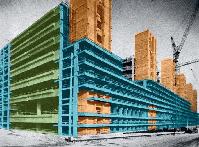 Hallauer turned out to be wrong, but initially it was also advantageous for the young office to transfer the concept from Münster, since the planning costs here had gotten completely out of hand. Secondary uses are well known in the history of architecture, and a comparison of the designs reveals the close relationship between the approaches. While working on the project, the architects learned of a new hospital being built in Hamilton, Ontario, Canada. In the spring of 1969, members of the office studied the new facility on site and were so fascinated by the concept that they began a fundamental redesign. The Canadian model was not simply copied, but further developed into the Aachen structural system.