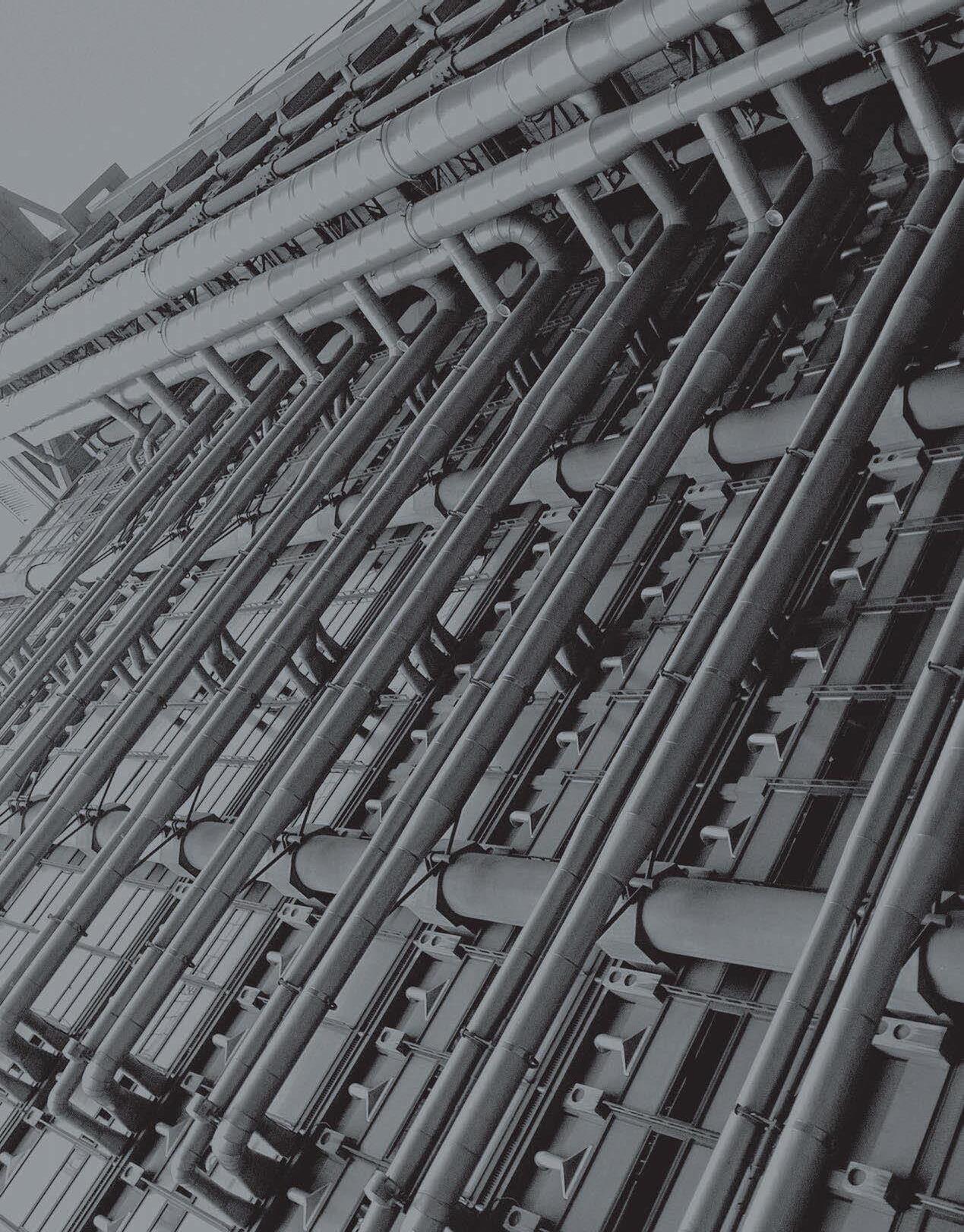High-tech, exploring the possibilities of iron and steel, and associated with glass, is based on the denial, or at least as Ludwig Mies van der Rohe referred to it, the unconcern for the classical composition, as defined by the French Beaux-Arts school, specifically by Julien Guadet in his manuals. This indifference towards composition and the classic rules is the cornerstone of high-tech, in other words, a strong belief in mechanical processes within a steel skeleton construction coordinated with glass, proposing an architecture that integrates industrial processes and construction technology into building design.