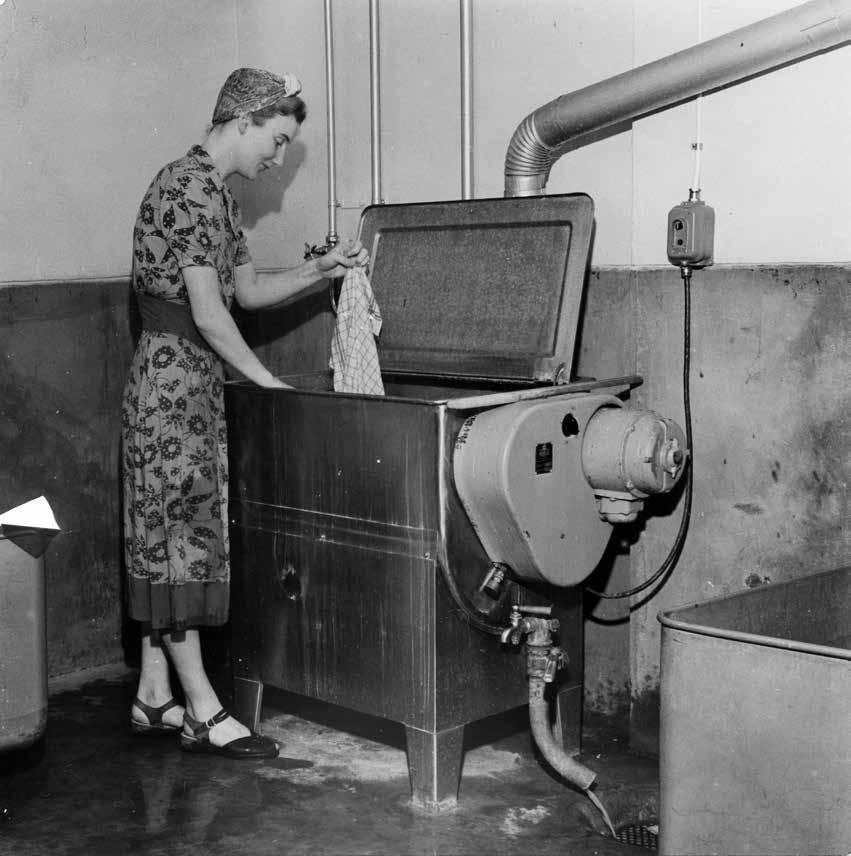 Communal laundry facility at municipal housing built by HSB in Stockholm mainly for large families at Slalomvägen, Västertorp. Several photos distributed by HSB are found in Catherine Bauer Wurster Papers, which includes notes on the backside. One comment she makes is: “Annual subsidies are paid by the state, to keep rents down, similar to the USHA program.”